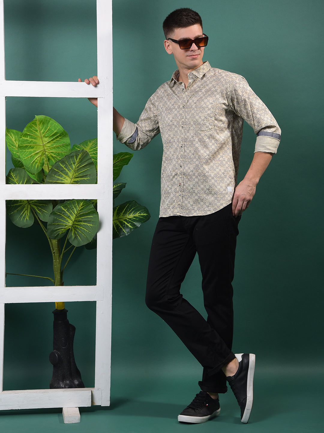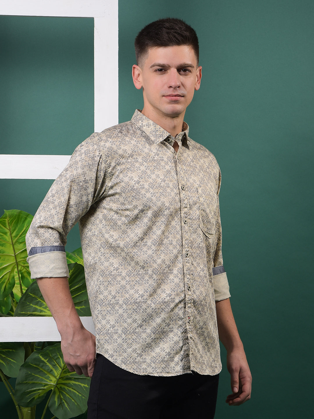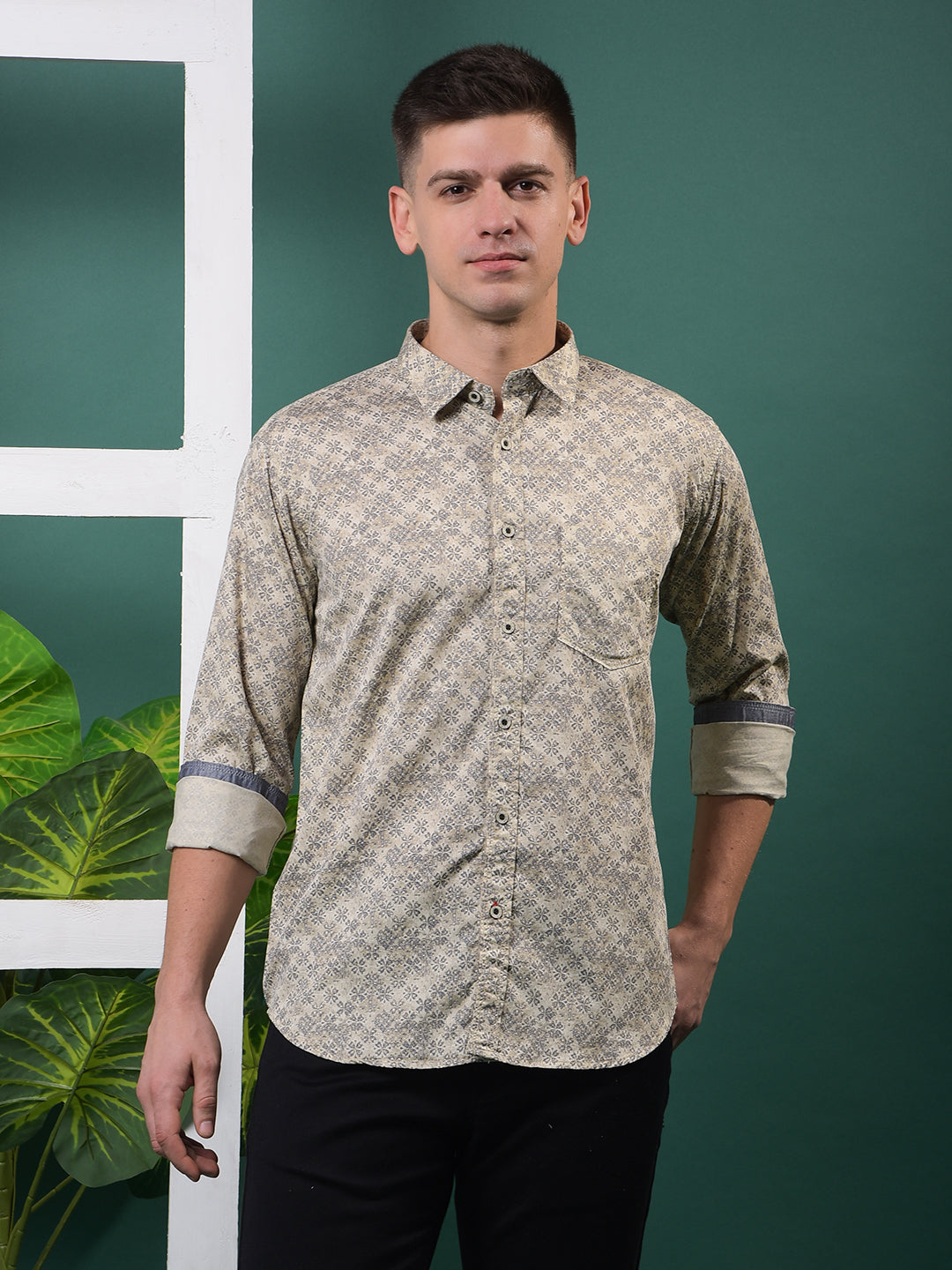 Understated yet stylish — Cobb’s Beige Printed Slim-Fit Casual Shirt blends neutral tones with modern prints for a smart, everyday edge.