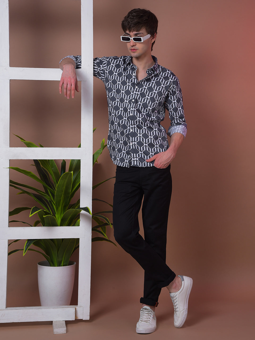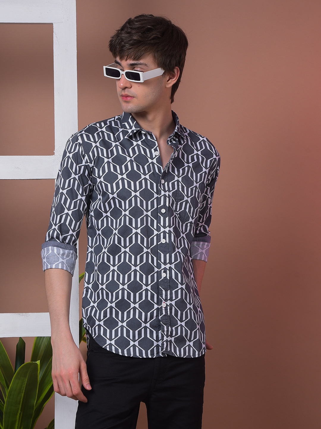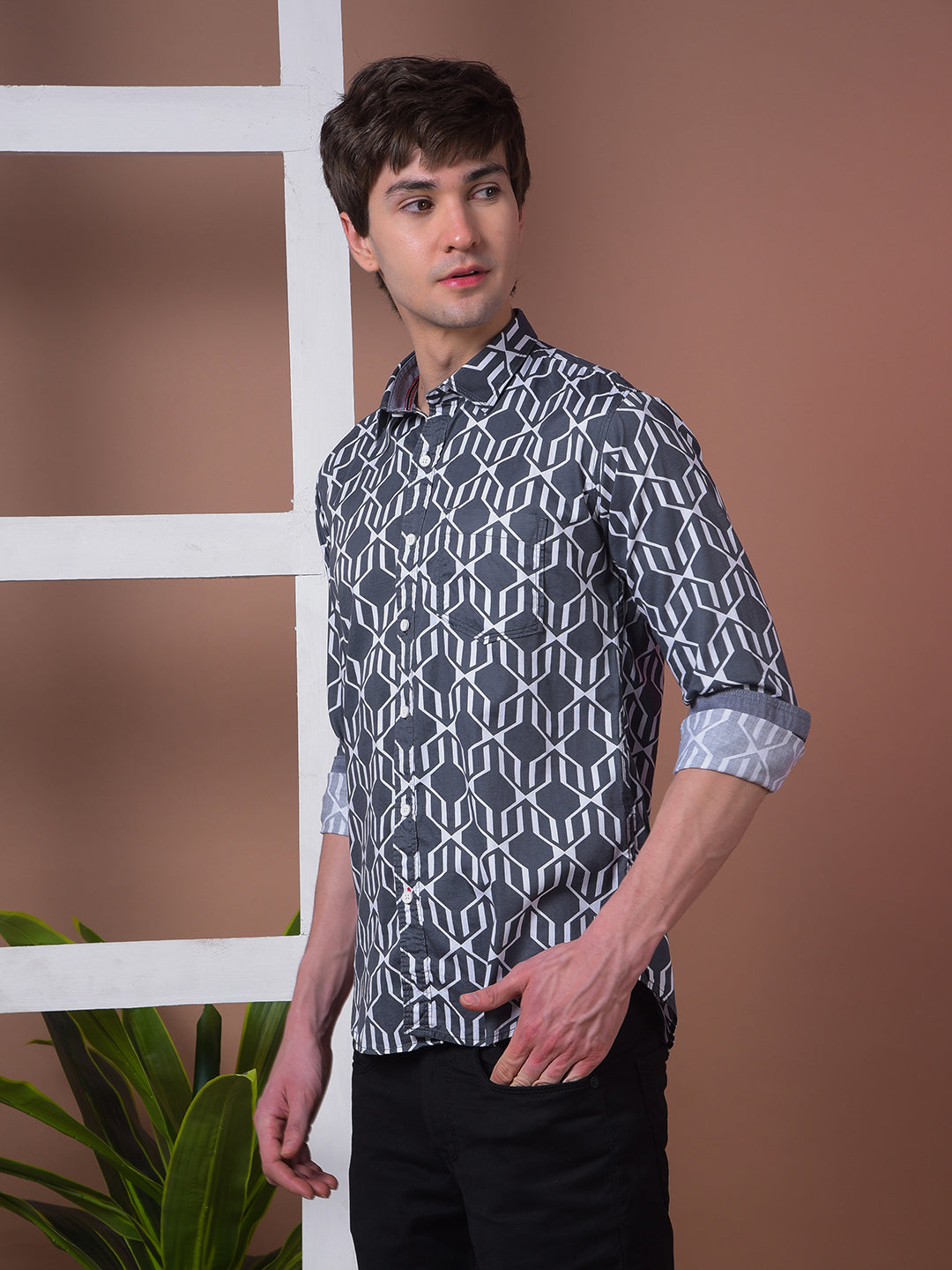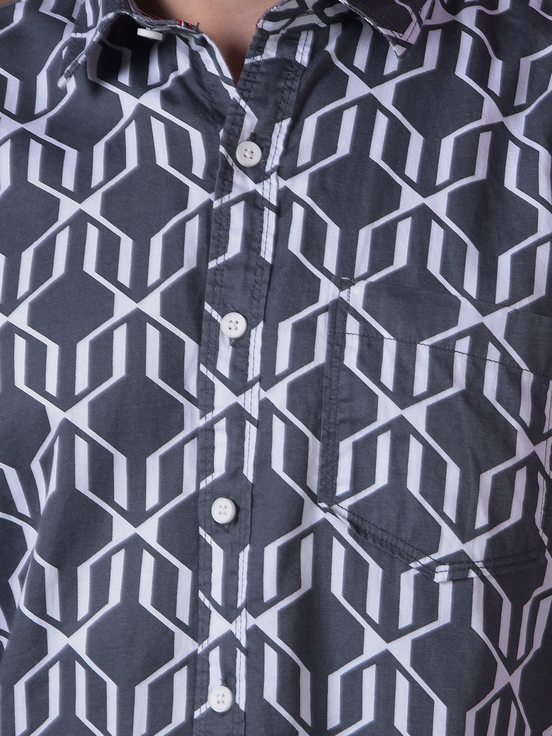 COBB Grey Printed Slim-Fit Casual Shirt blends subtle prints with a tailored fit, perfect for a smart, contemporary casual look. Ideal for work or weekend outings.