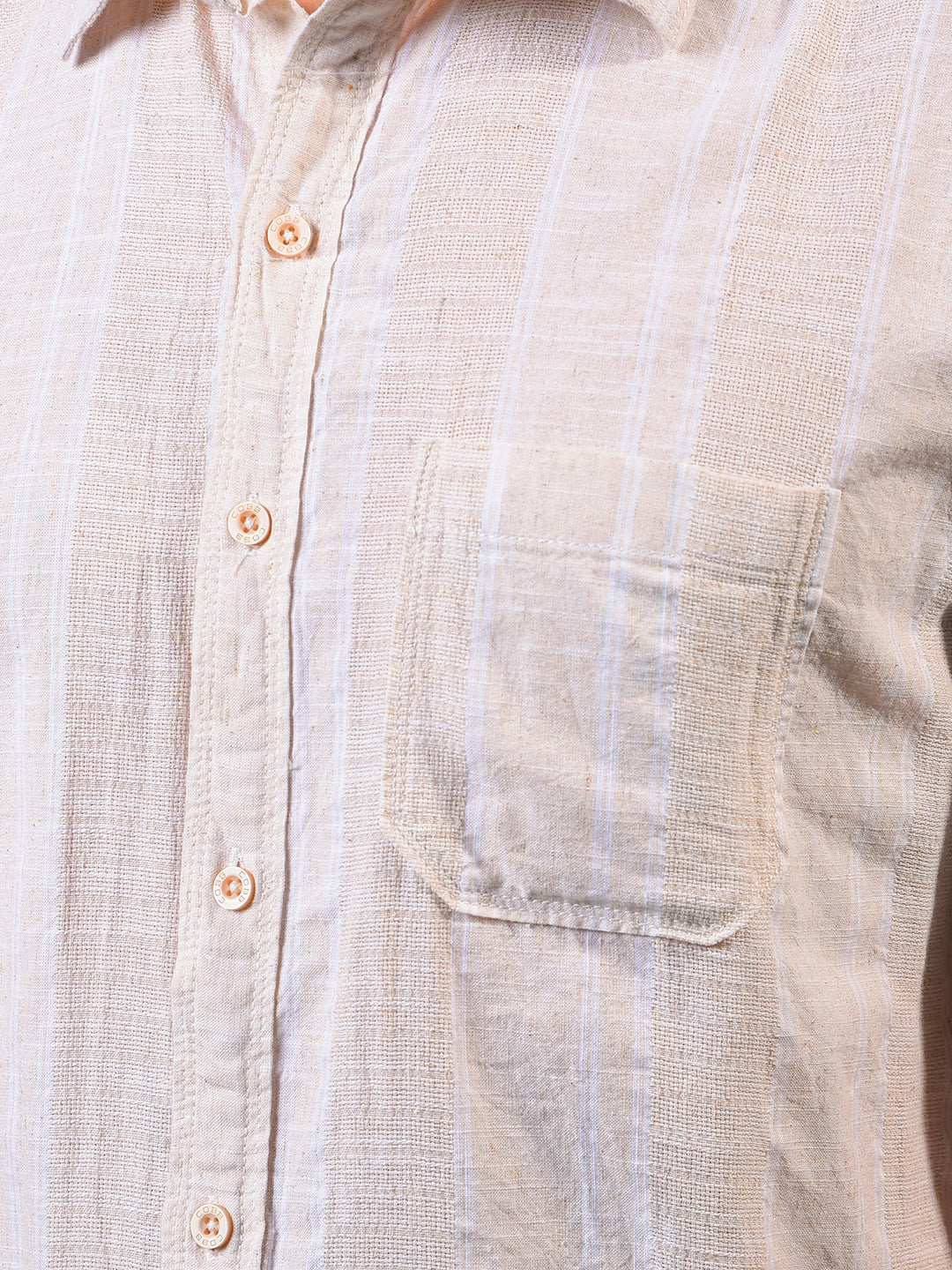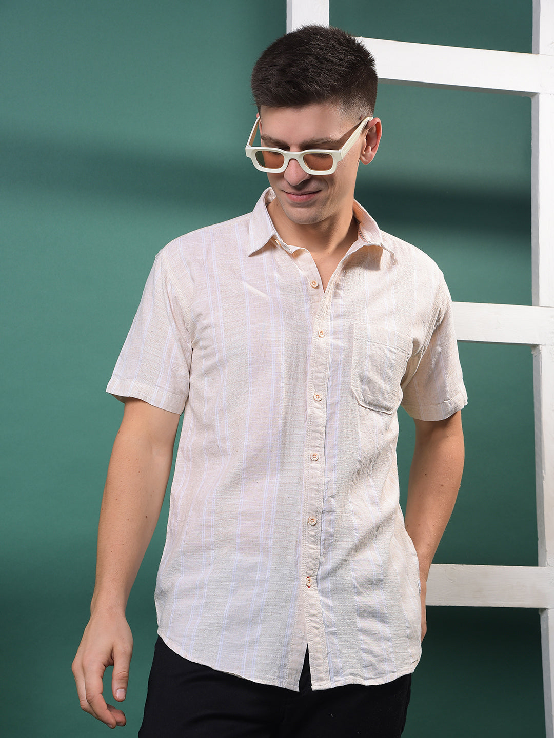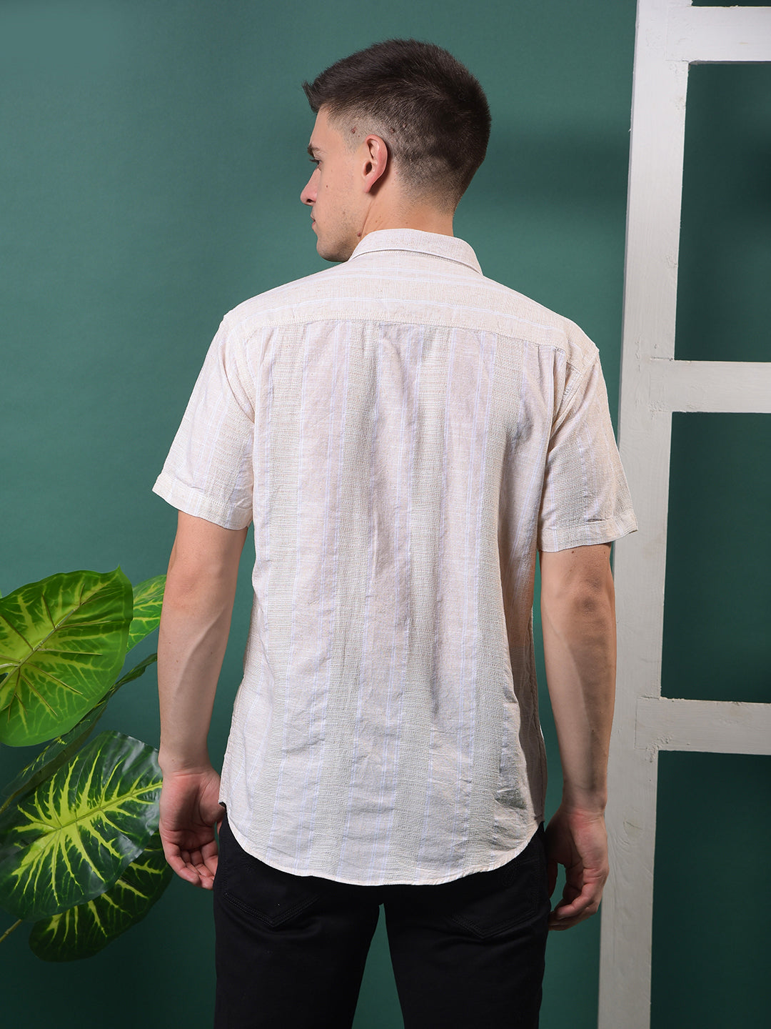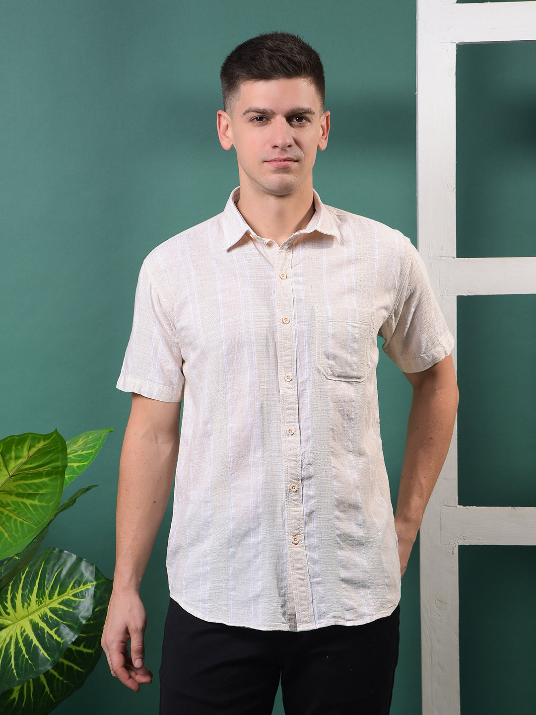 COBB BEIGE STRIPED HALF-SLEEVE CASUAL SHIRT