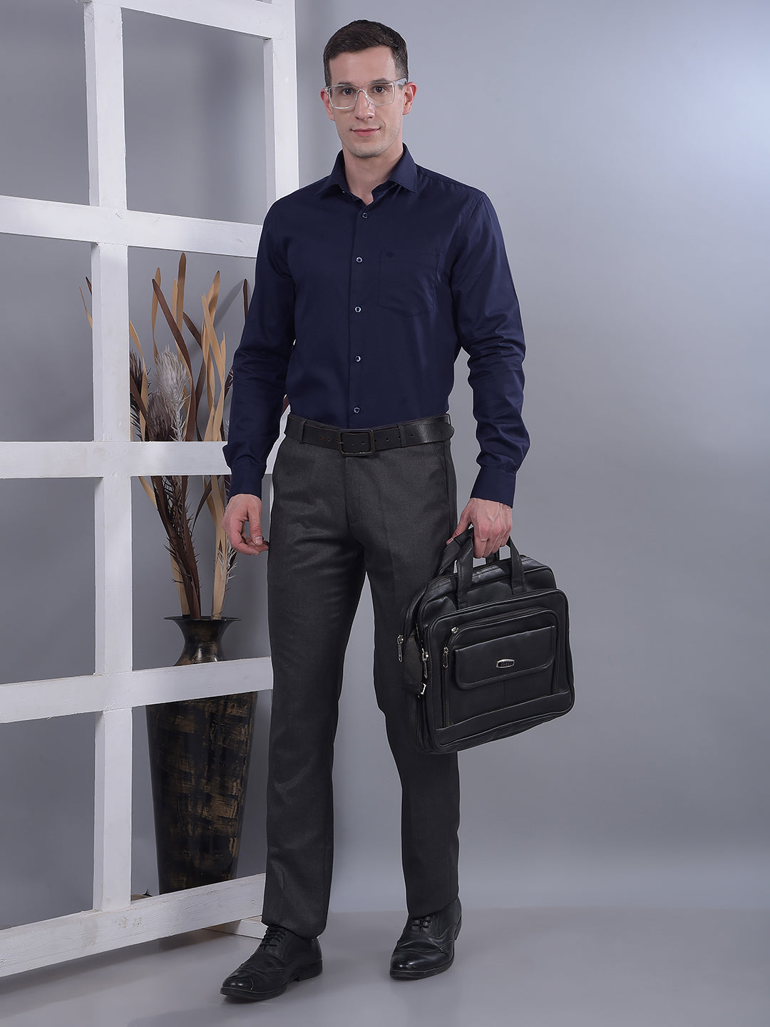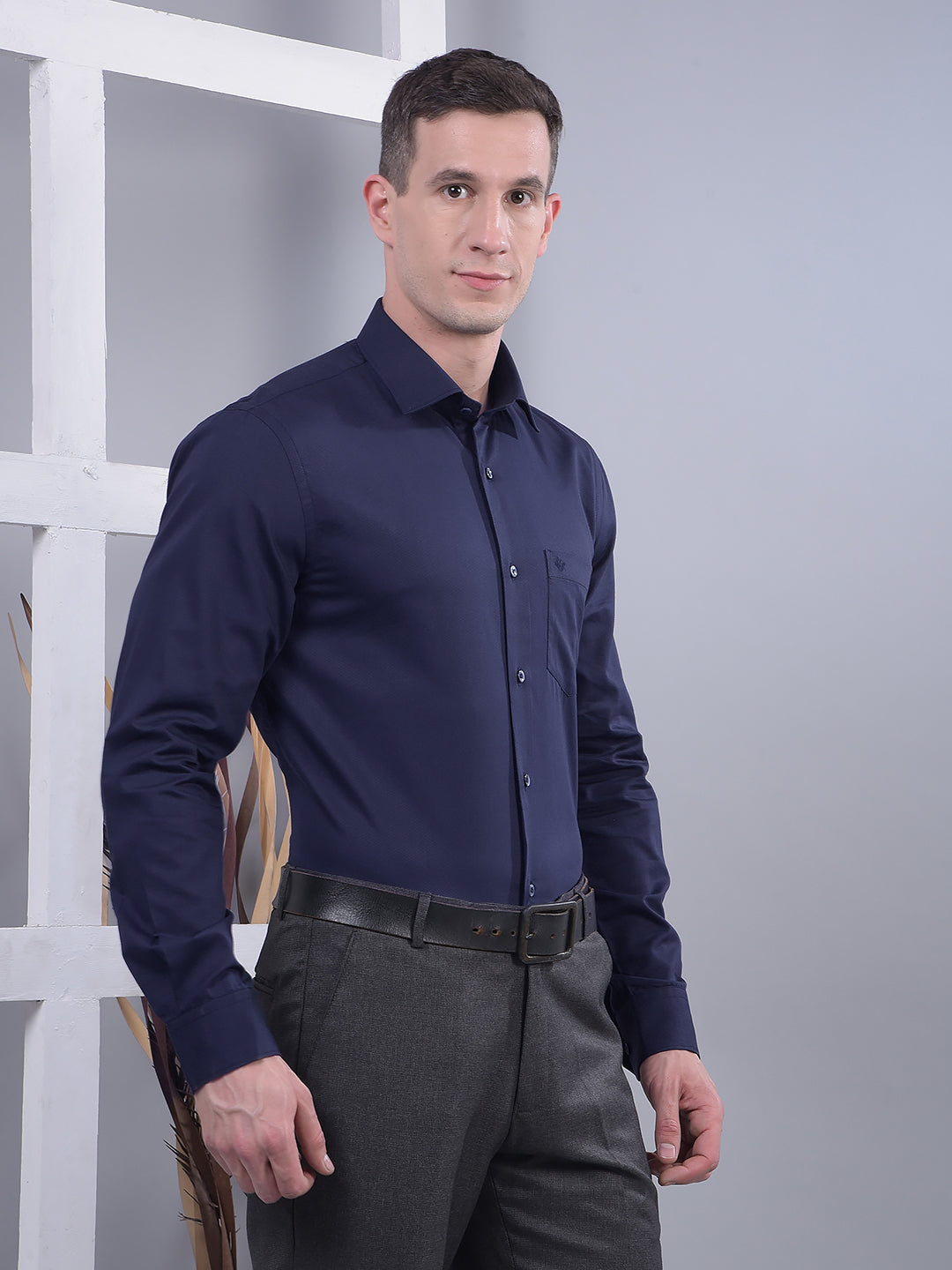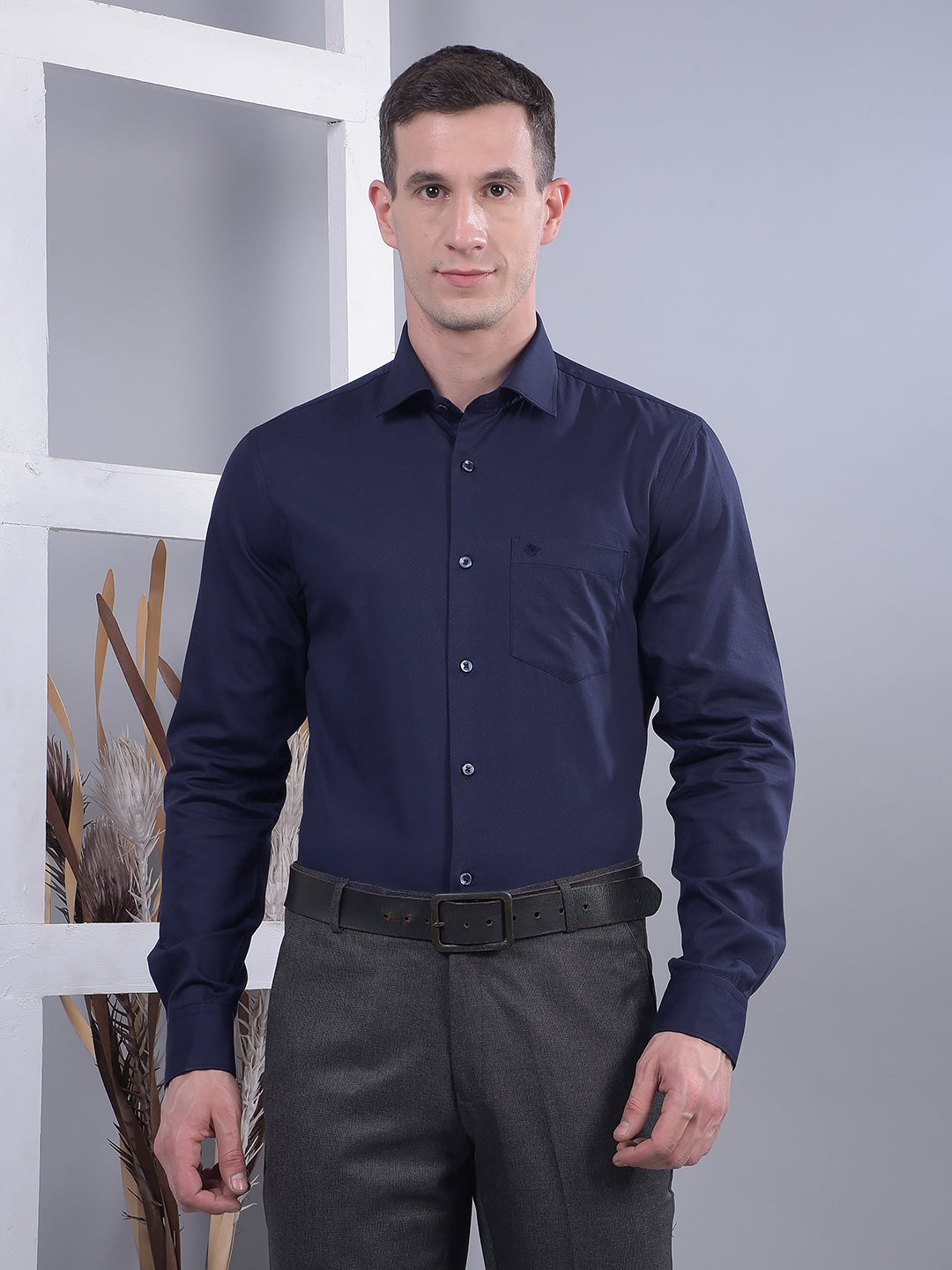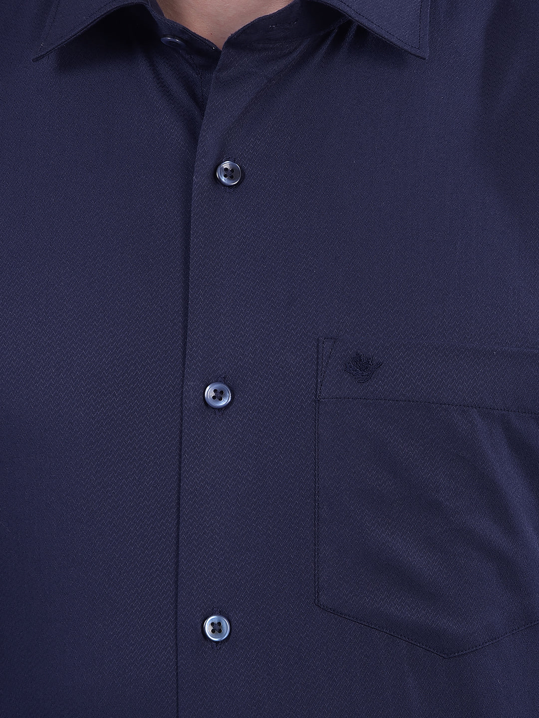 Sharp, refined, and effortlessly stylish — Cobb's Navy Blue Self-Design Slim-Fit Formal Shirt is your go-to for a powerful, polished impression.