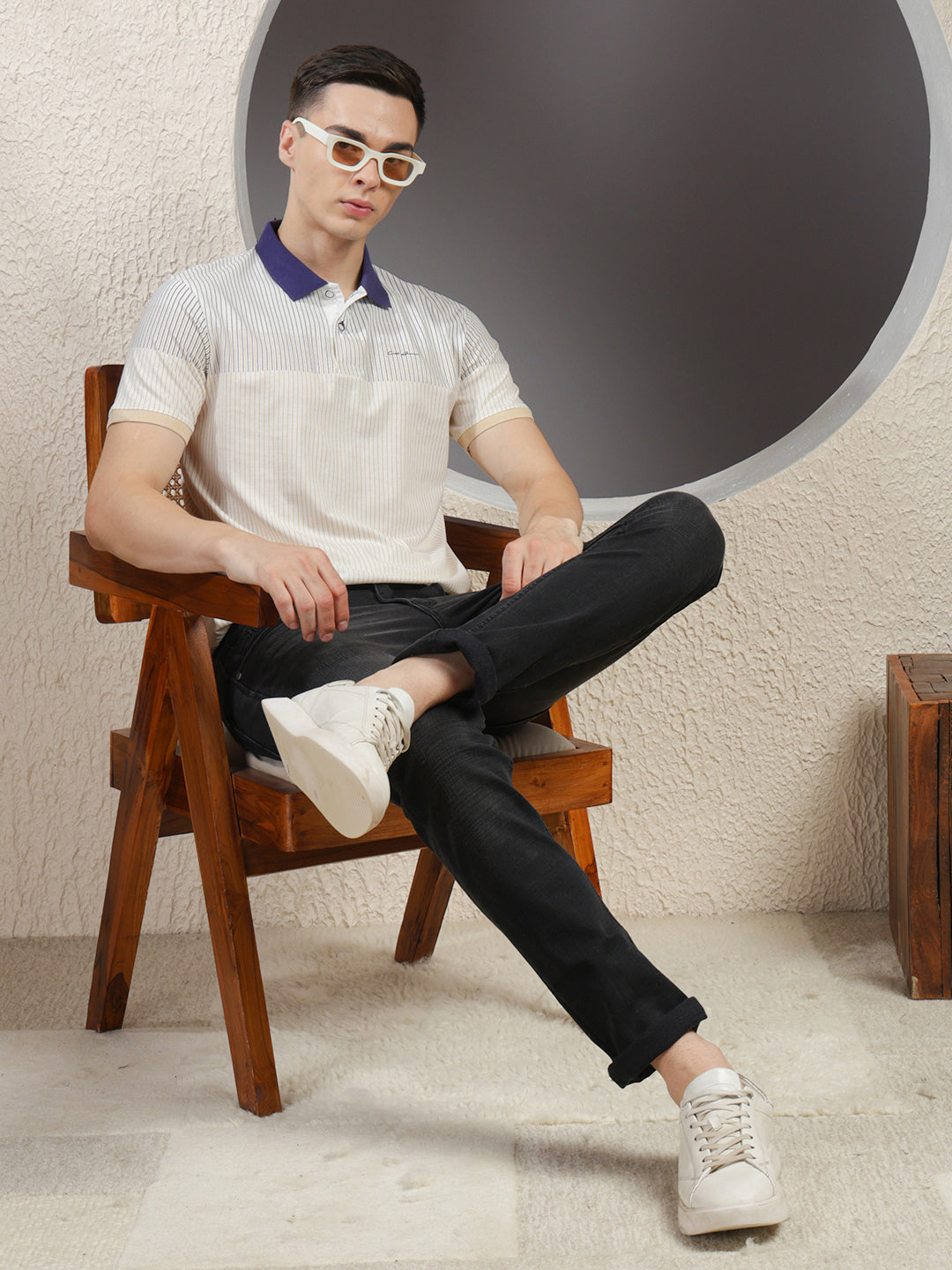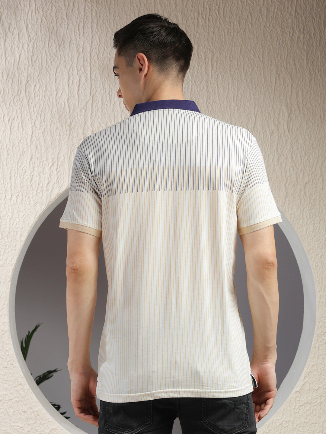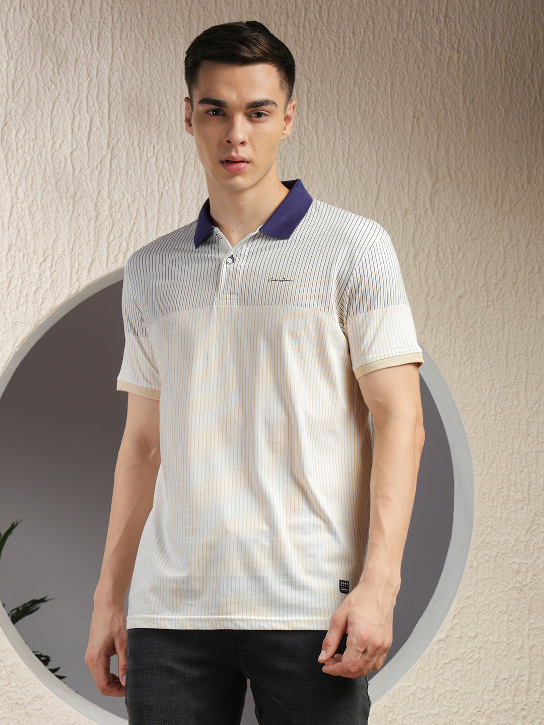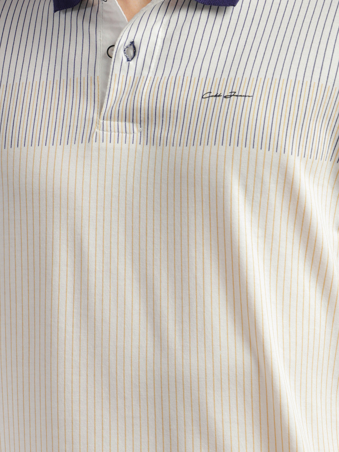 Made from premium cotton blend fabric, this polo features a crisp white base with stylish stripes, a classic collar with a button placket, and short sleeves for a smart-casual look.