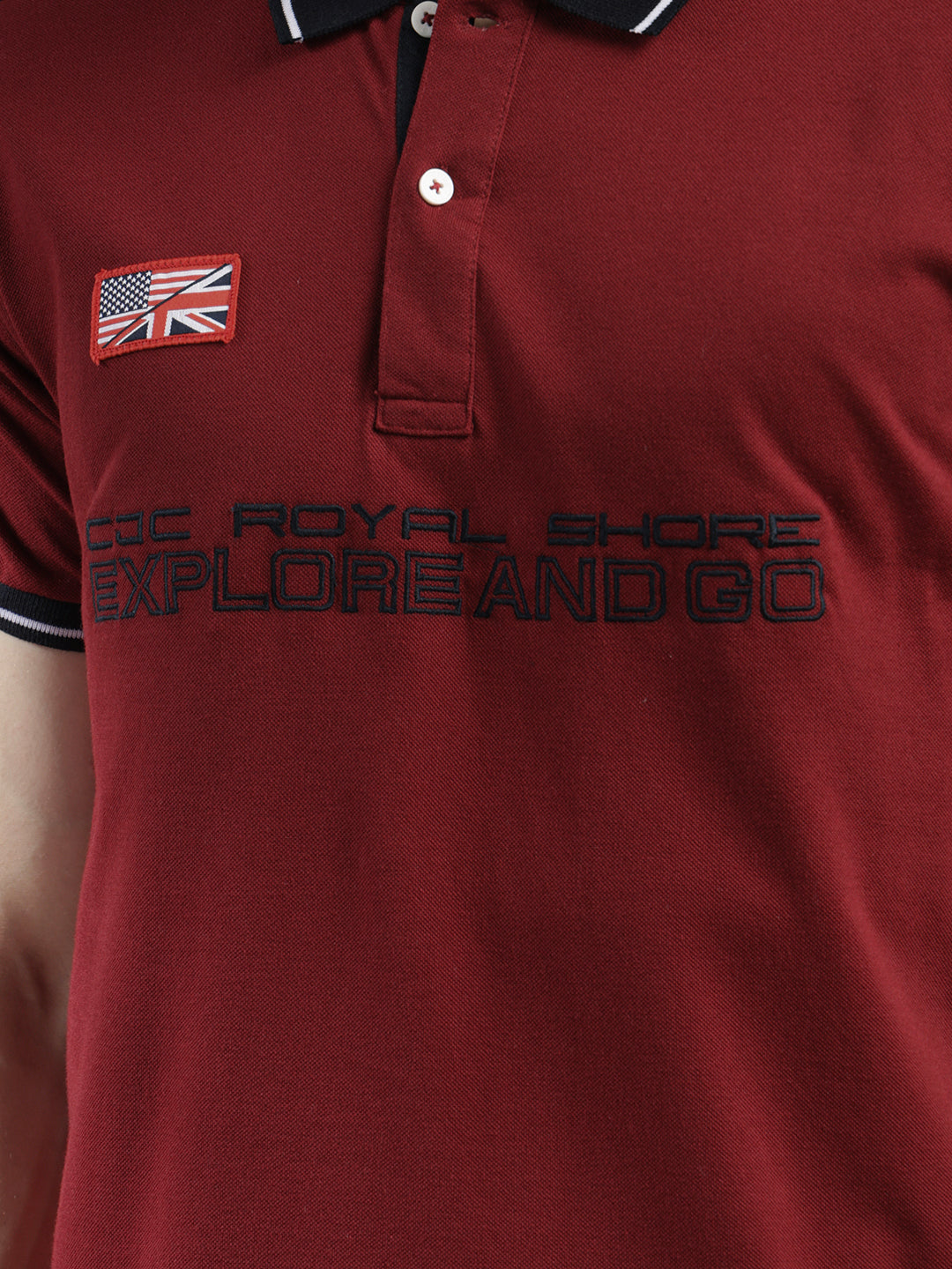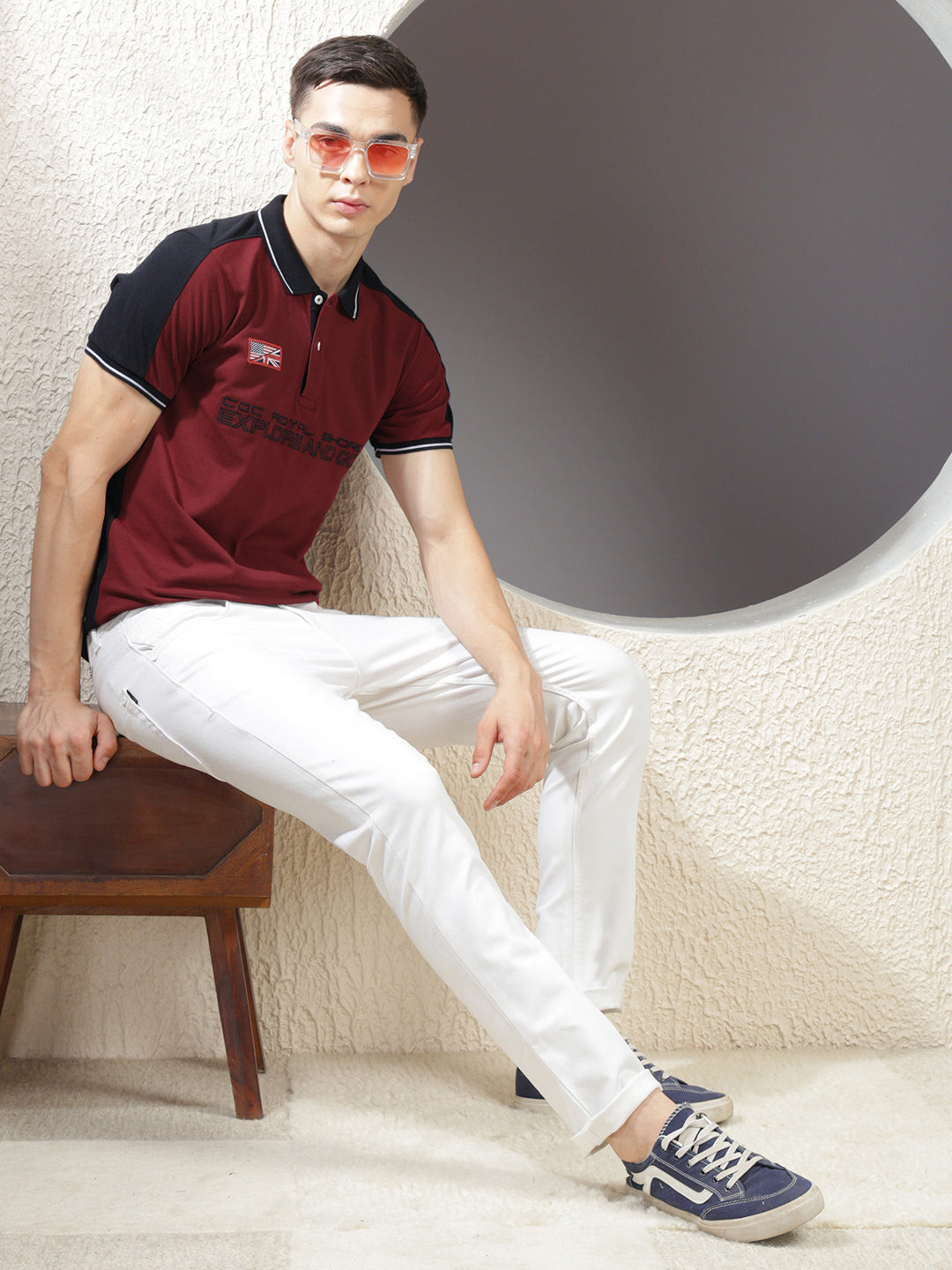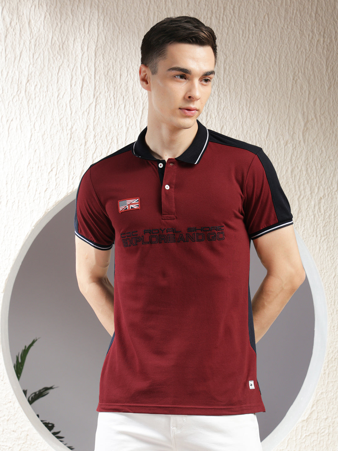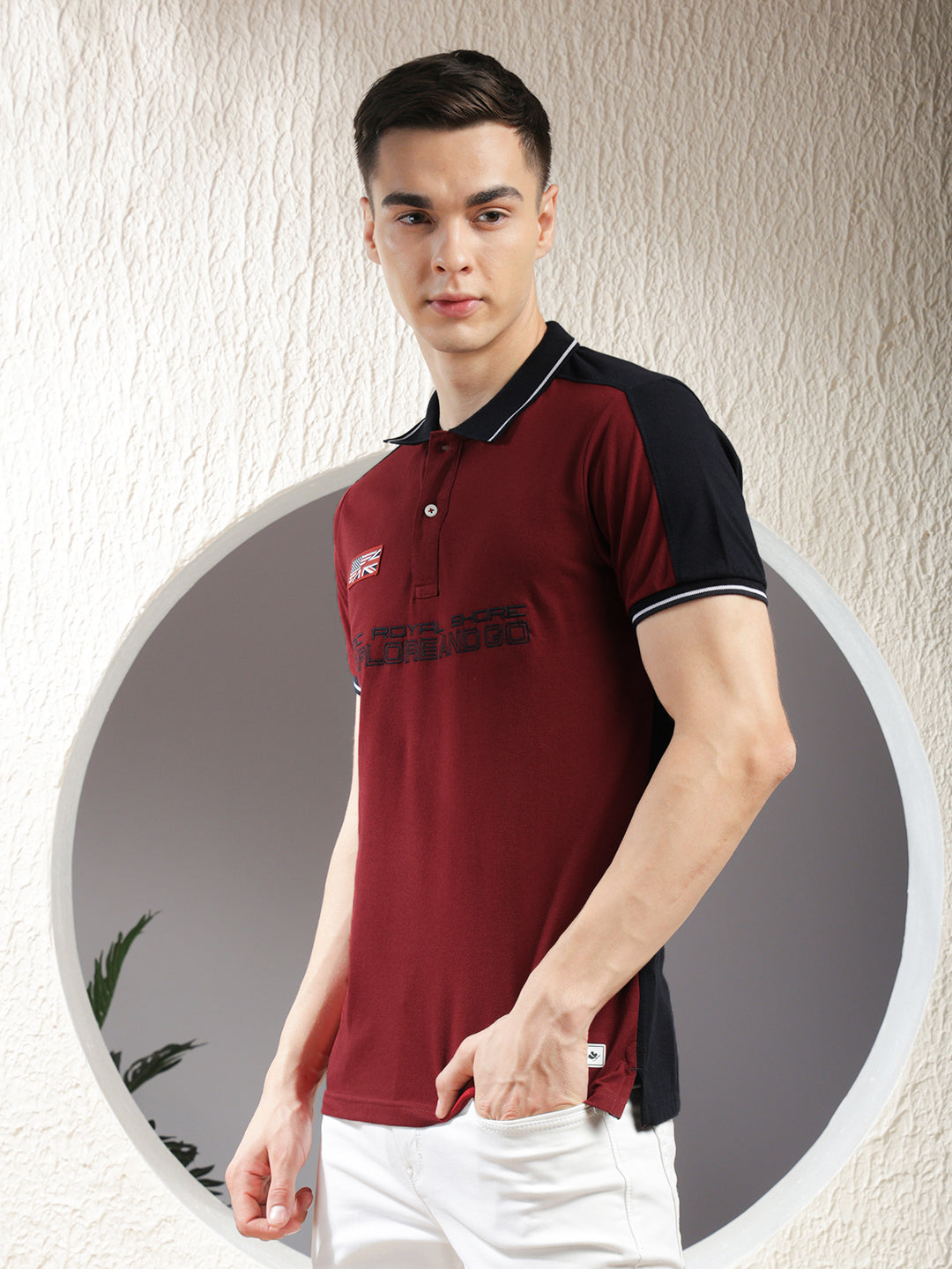 COBB Maroon Color-Block Polo Neck T-Shirt features bold maroon hues with contrasting panels, classic polo collar, and soft cotton fabric for all-day comfort and style.