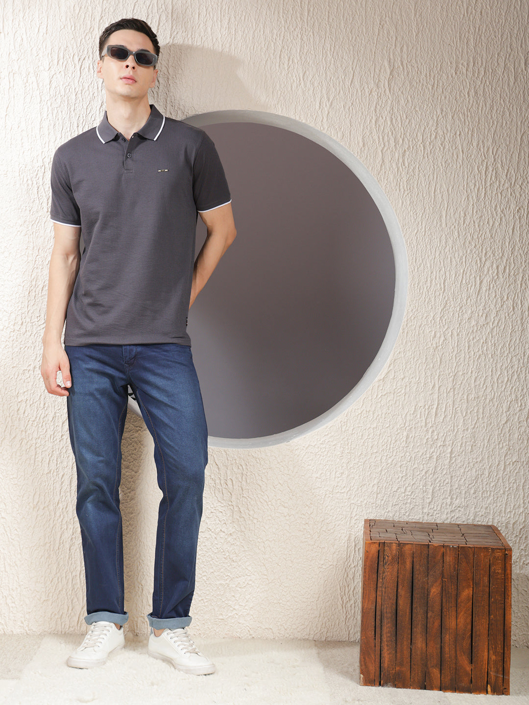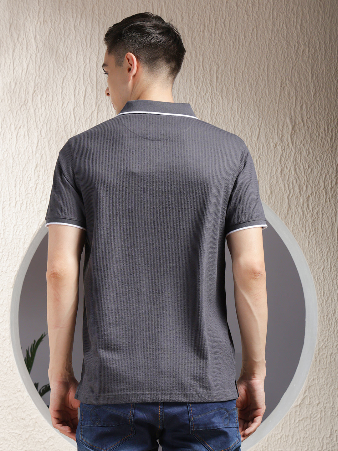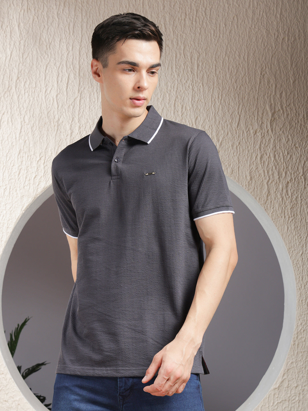 COBB Dark Grey Striped Polo Neck T-Shirt features a modern striped pattern with a refined polo collar, ensuring both comfort and a smart casual look.