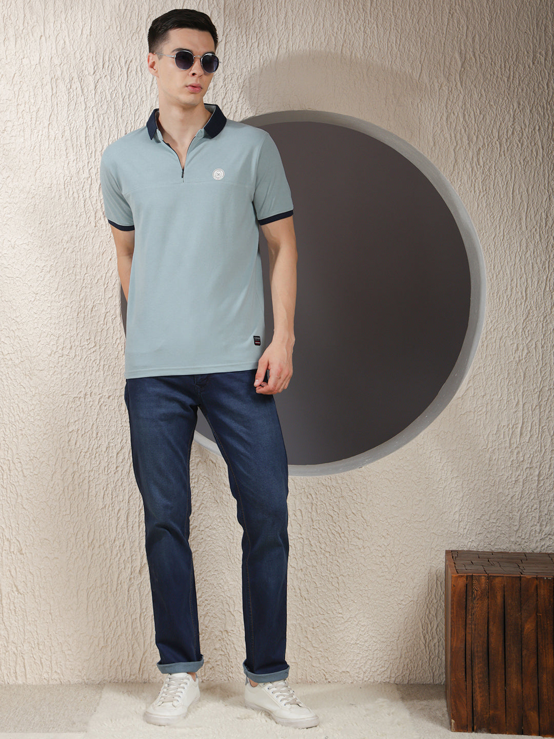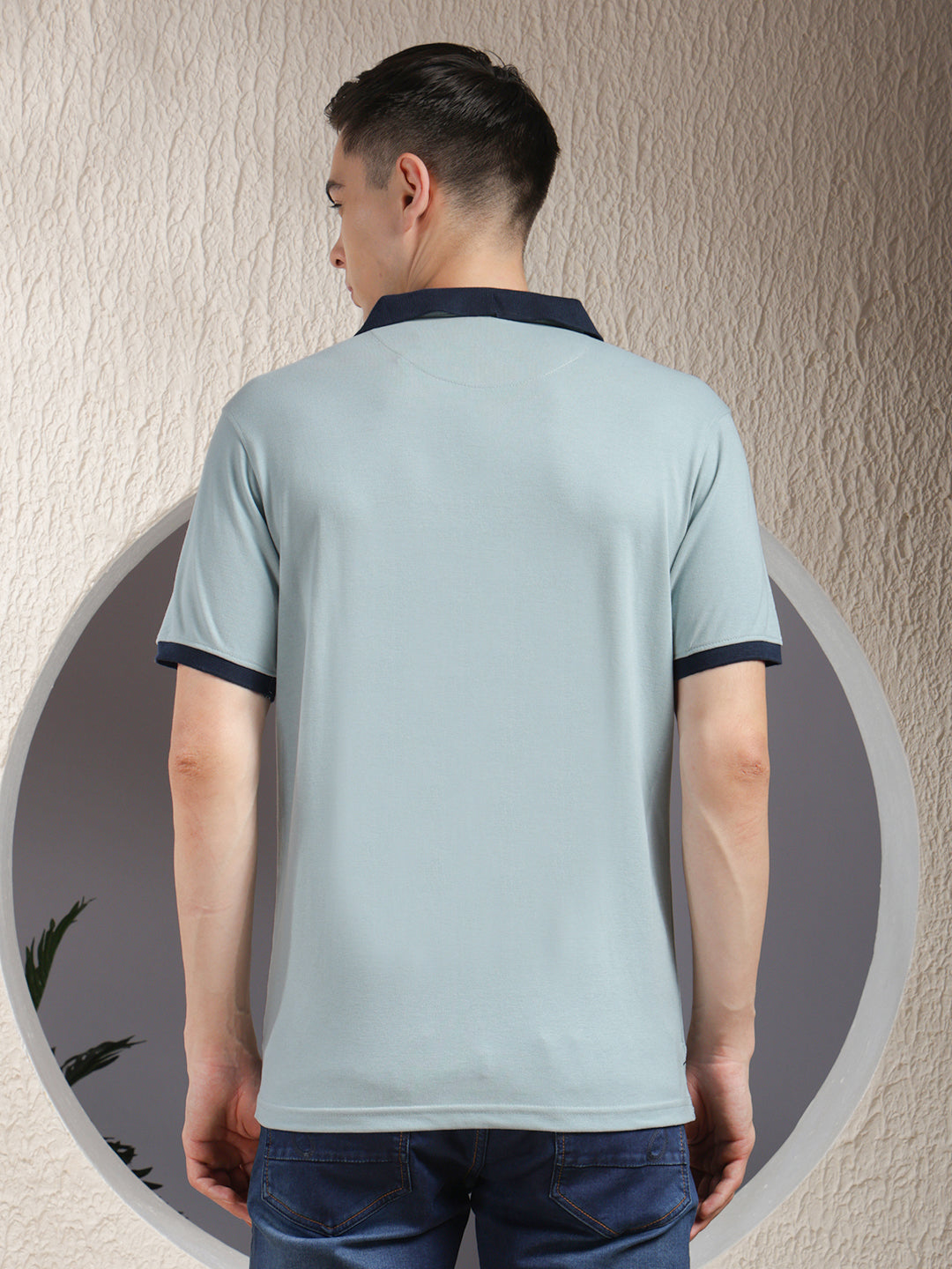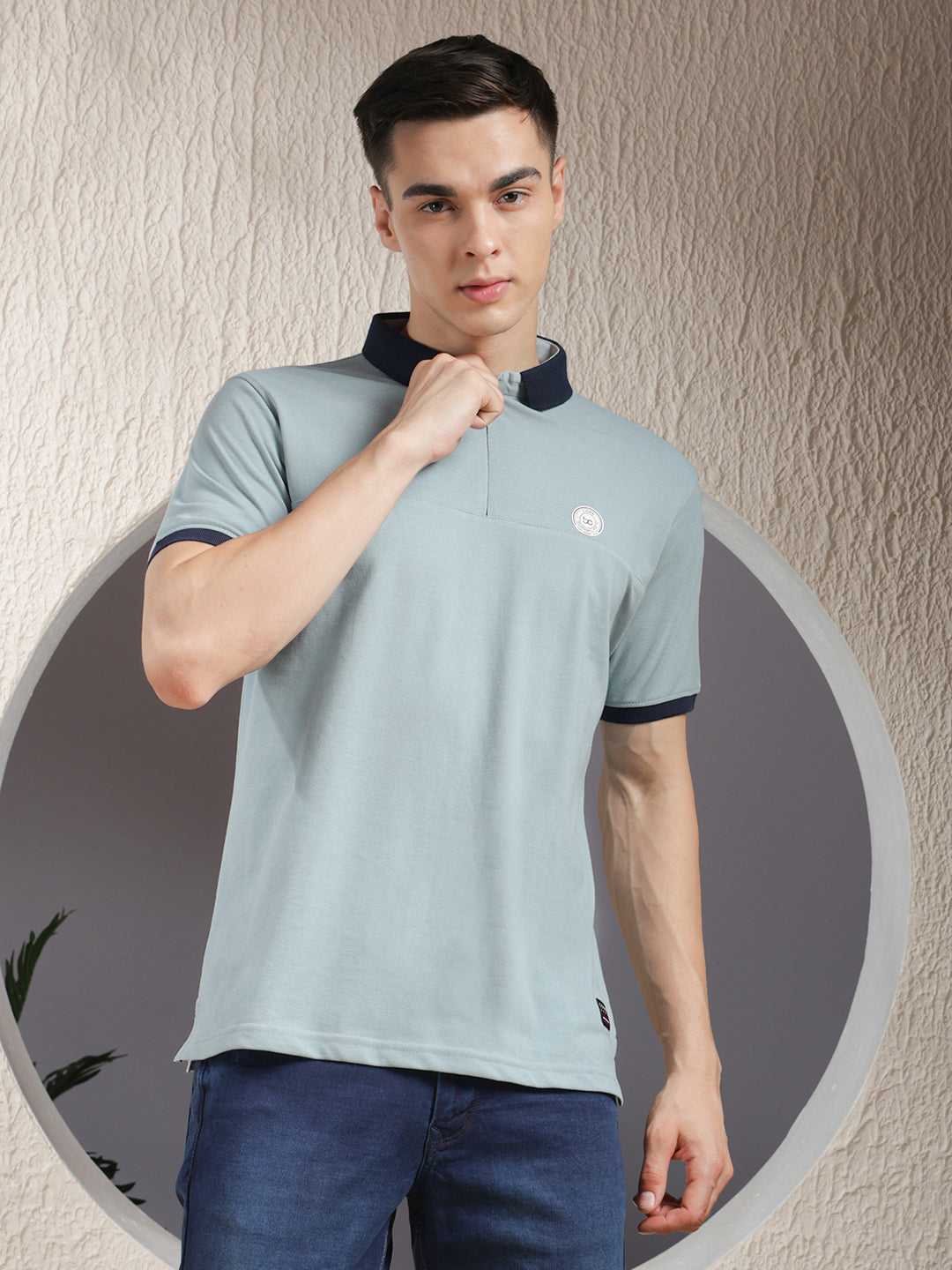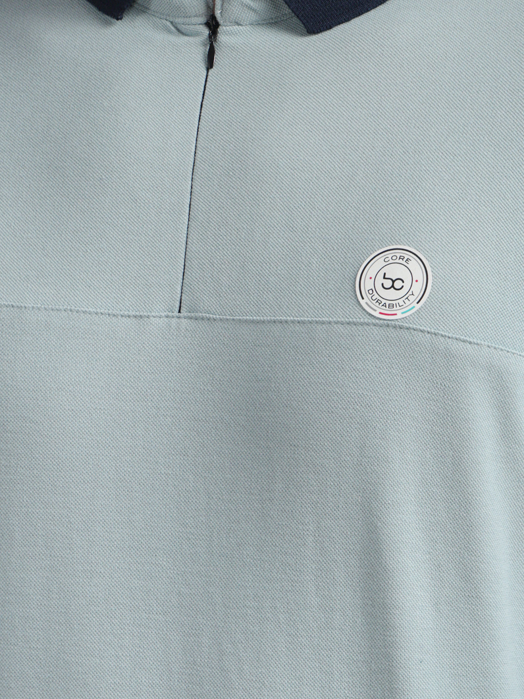 COBB Solid Sea Green Polo Neck Zipper T-Shirt offers a refreshing tone with a modern zipper collar, soft breathable fabric, and a tailored fit for smart casual appeal.