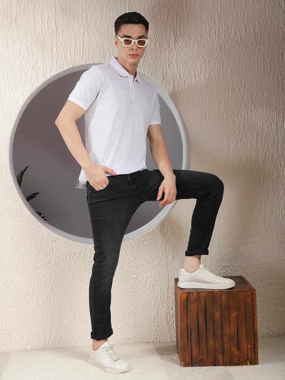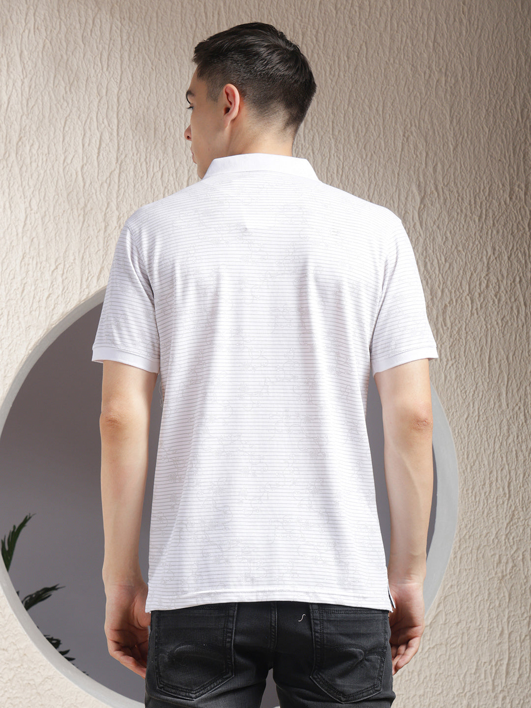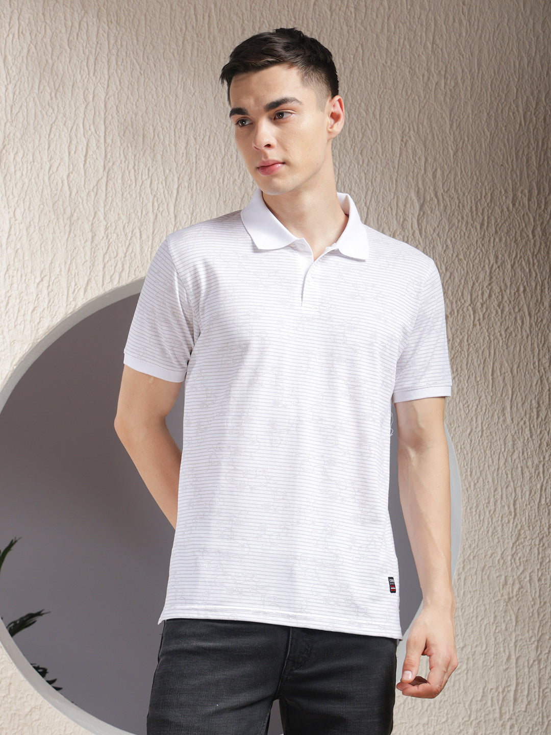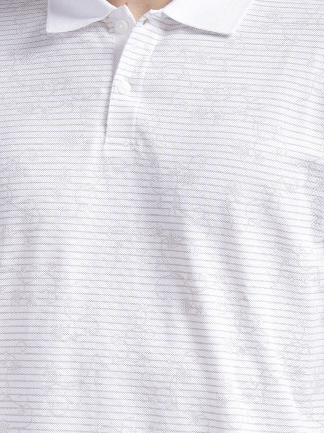Crafted from soft, breathable fabric, this polo showcases a clean white base with trendy printed detailing, a classic collar, short sleeves, and a comfortable fit for effortless everyday style.
