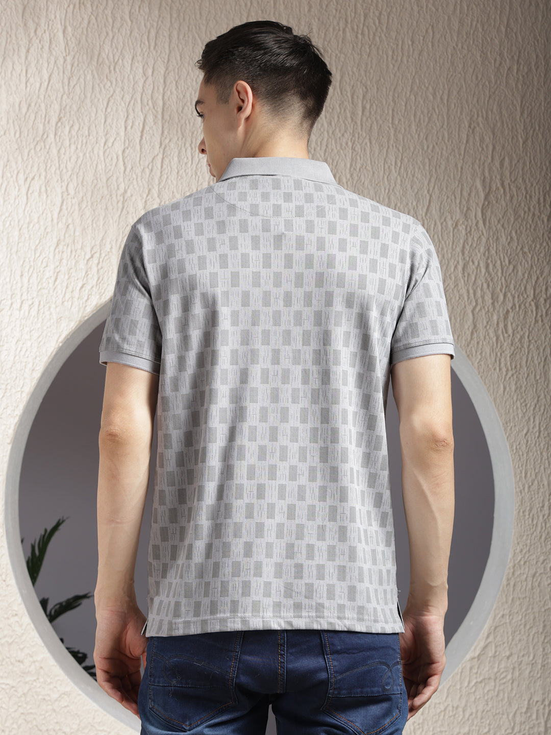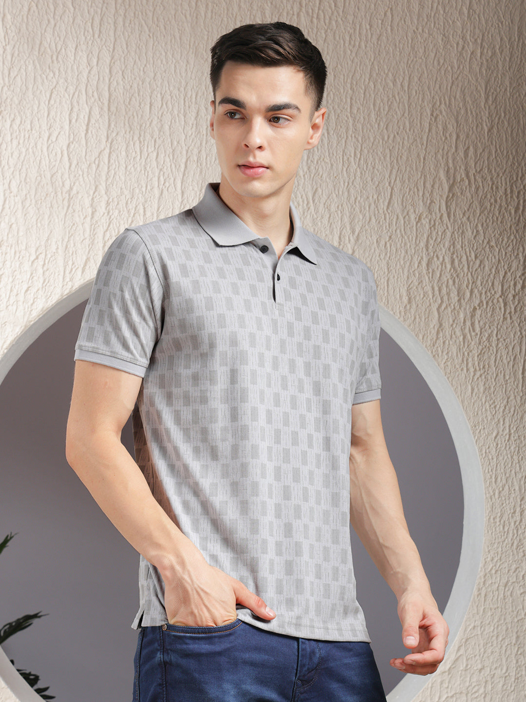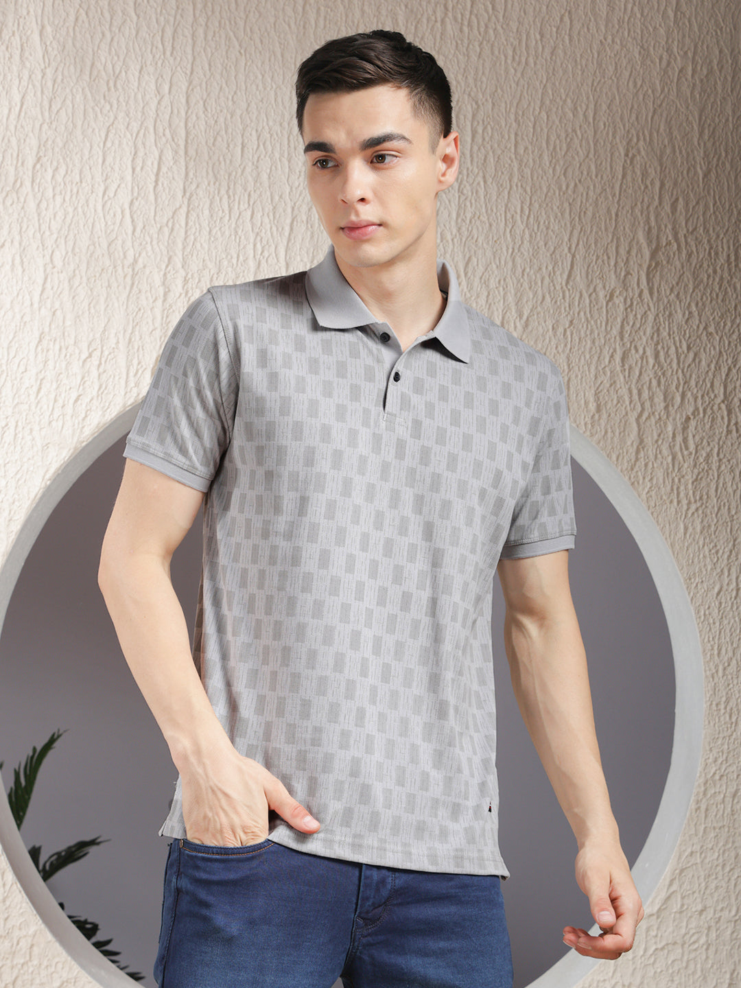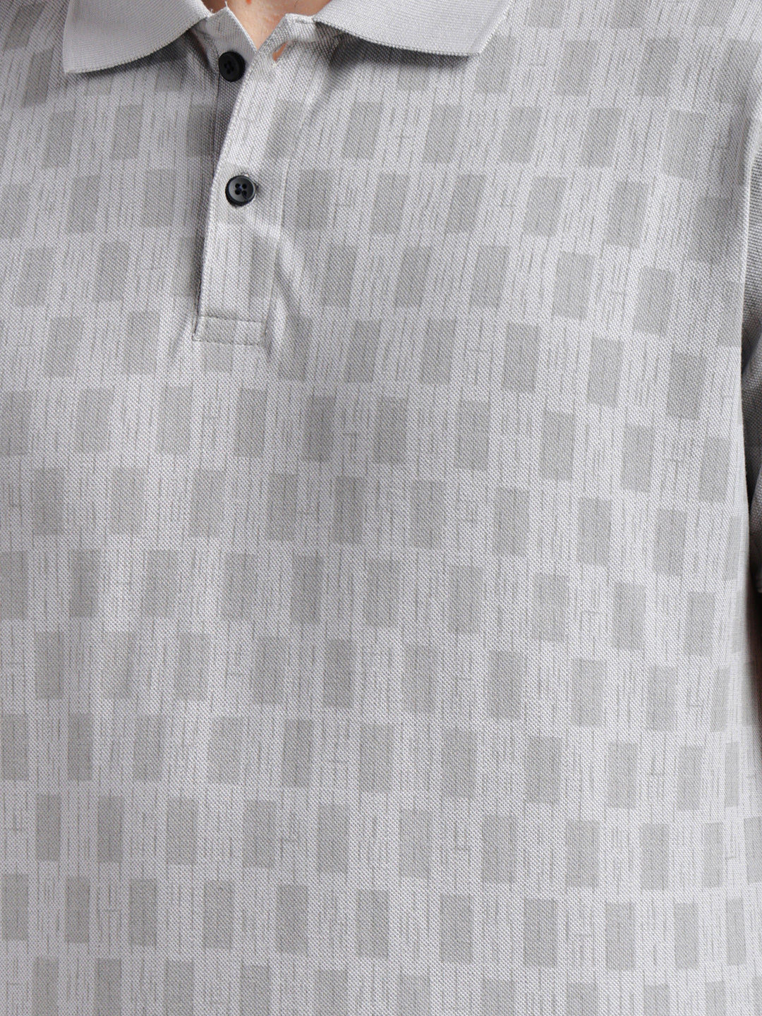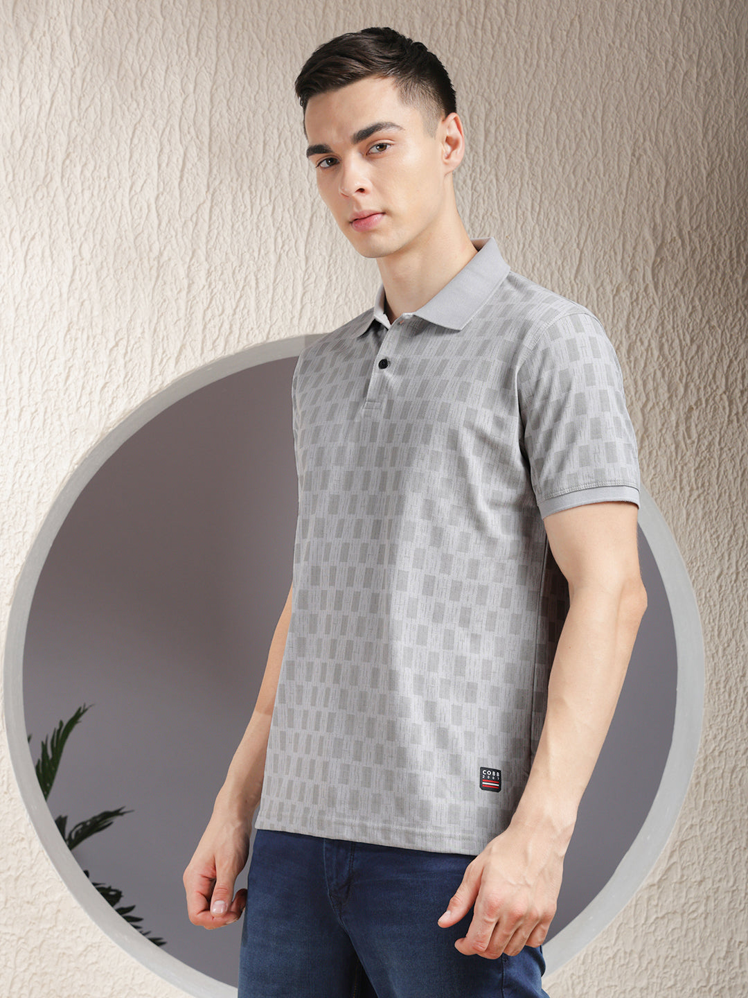 COBB Grey Printed Polo Neck T-Shirt features a stylish print with a structured collar design, offering a smart-casual look ideal for daily and weekend wear.
