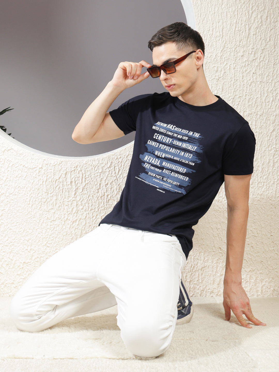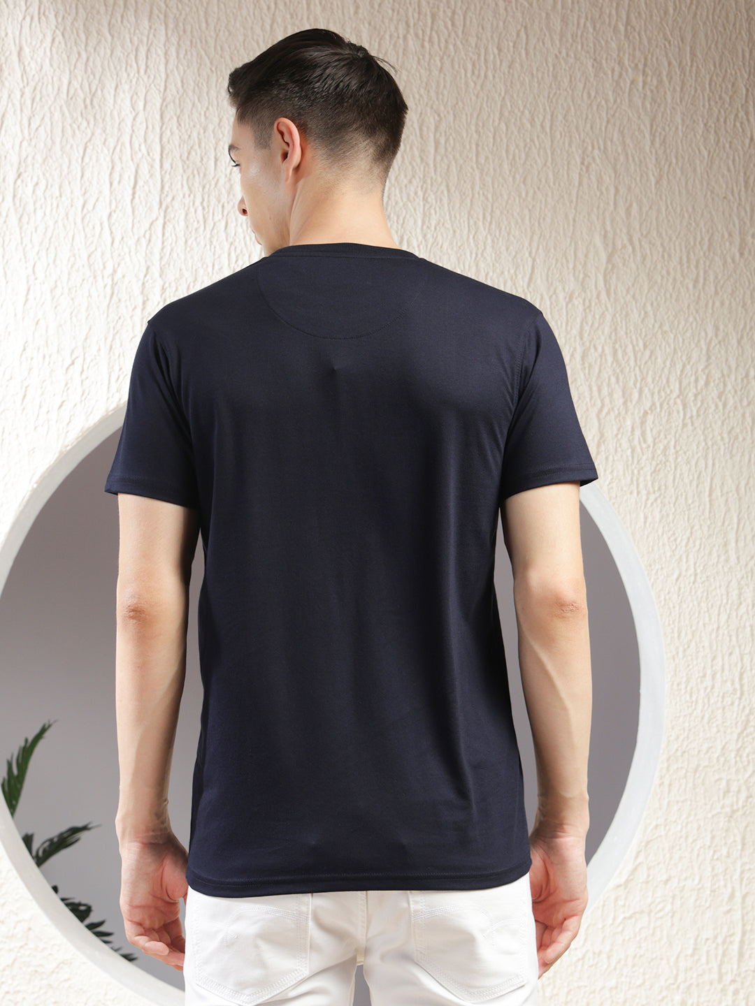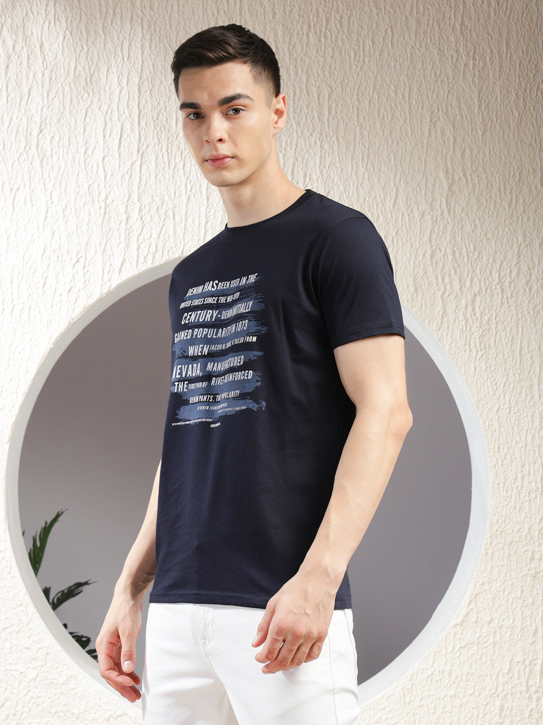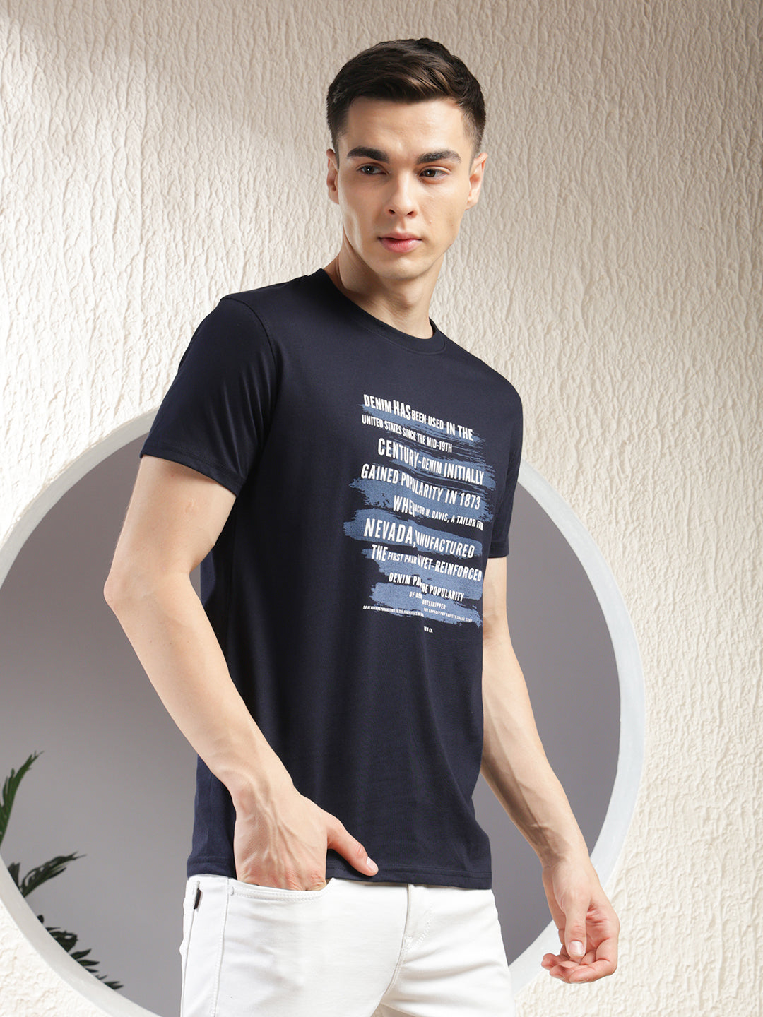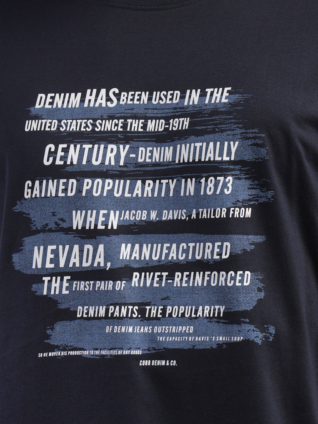 COBB Navy Blue Printed Round Neck T-Shirt – Crafted from a soft cotton blend, this tee features an eye-catching print on the front, a classic round neckline, and short sleeves for effortless casual style.