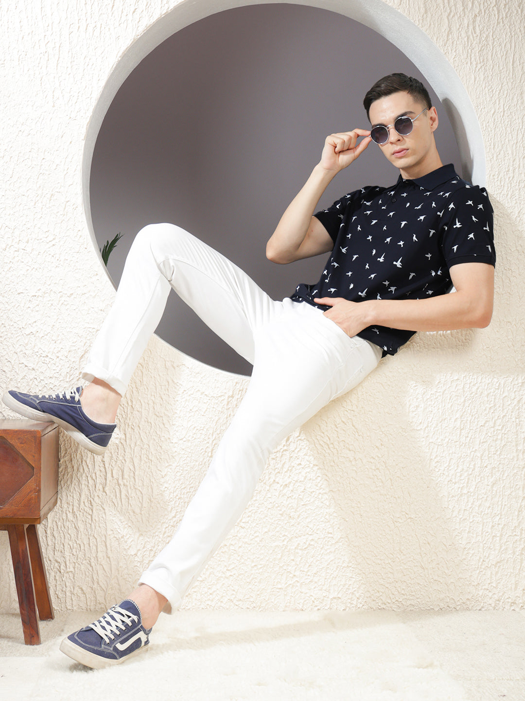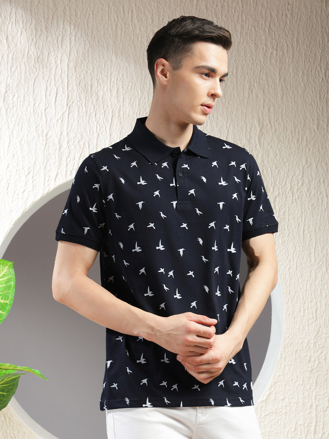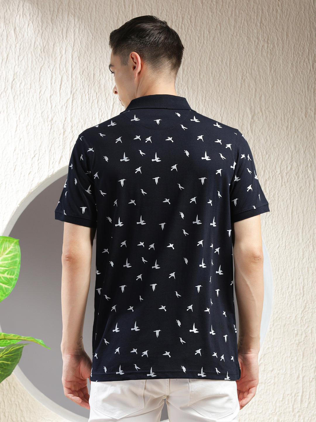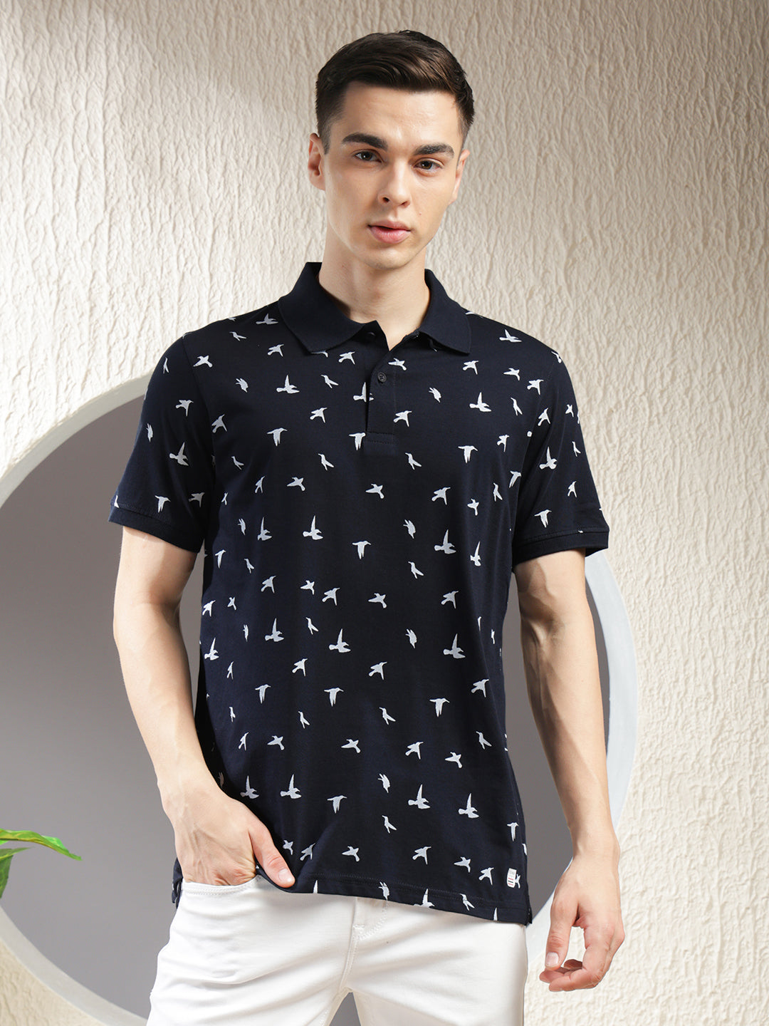 COBB Navy Blue Printed Polo Neck T-Shirt – designed with a smart polo collar and stylish print. Crafted from soft, breathable fabric for comfort, making it a perfect pick for casual outings and daily wear.