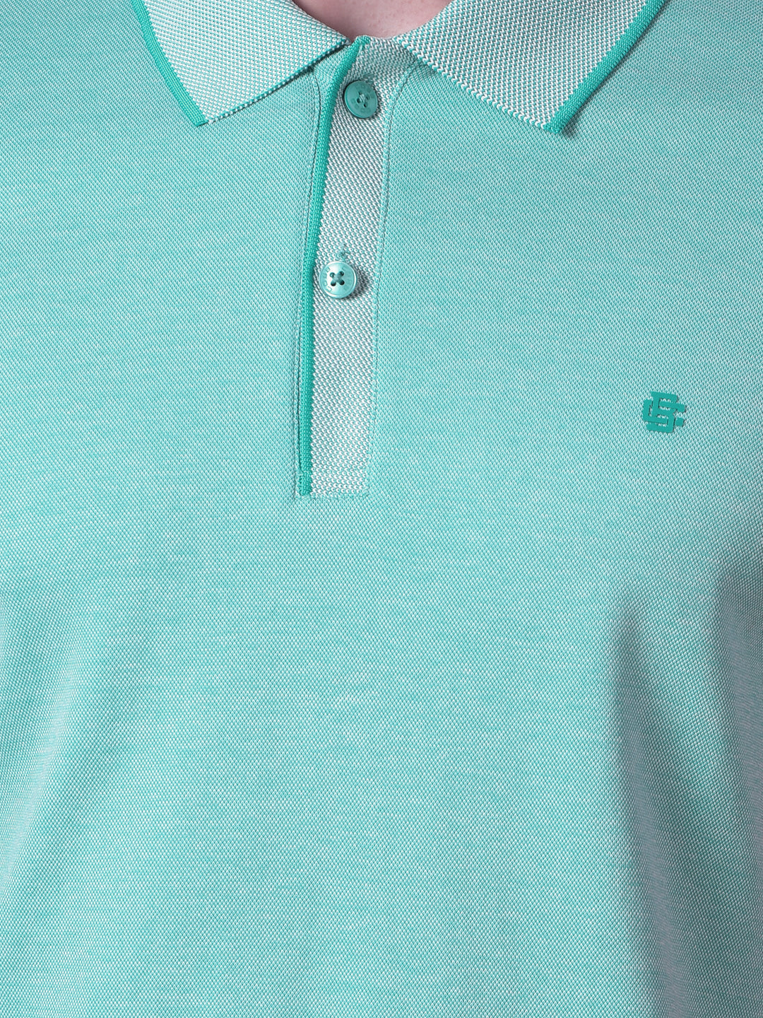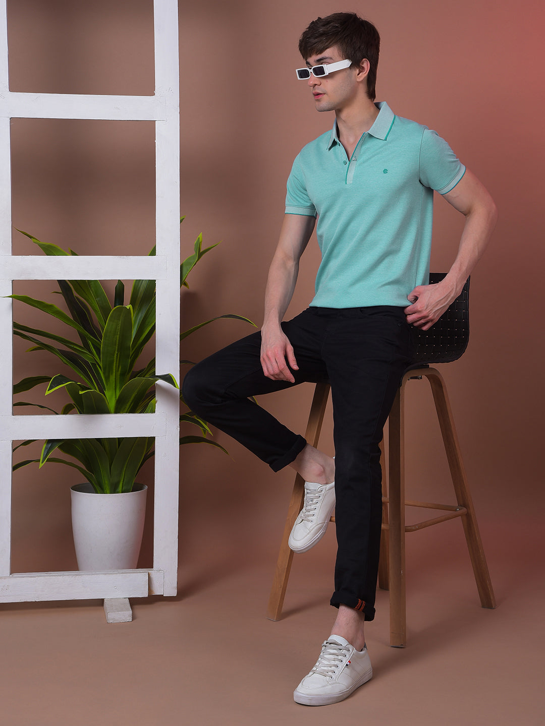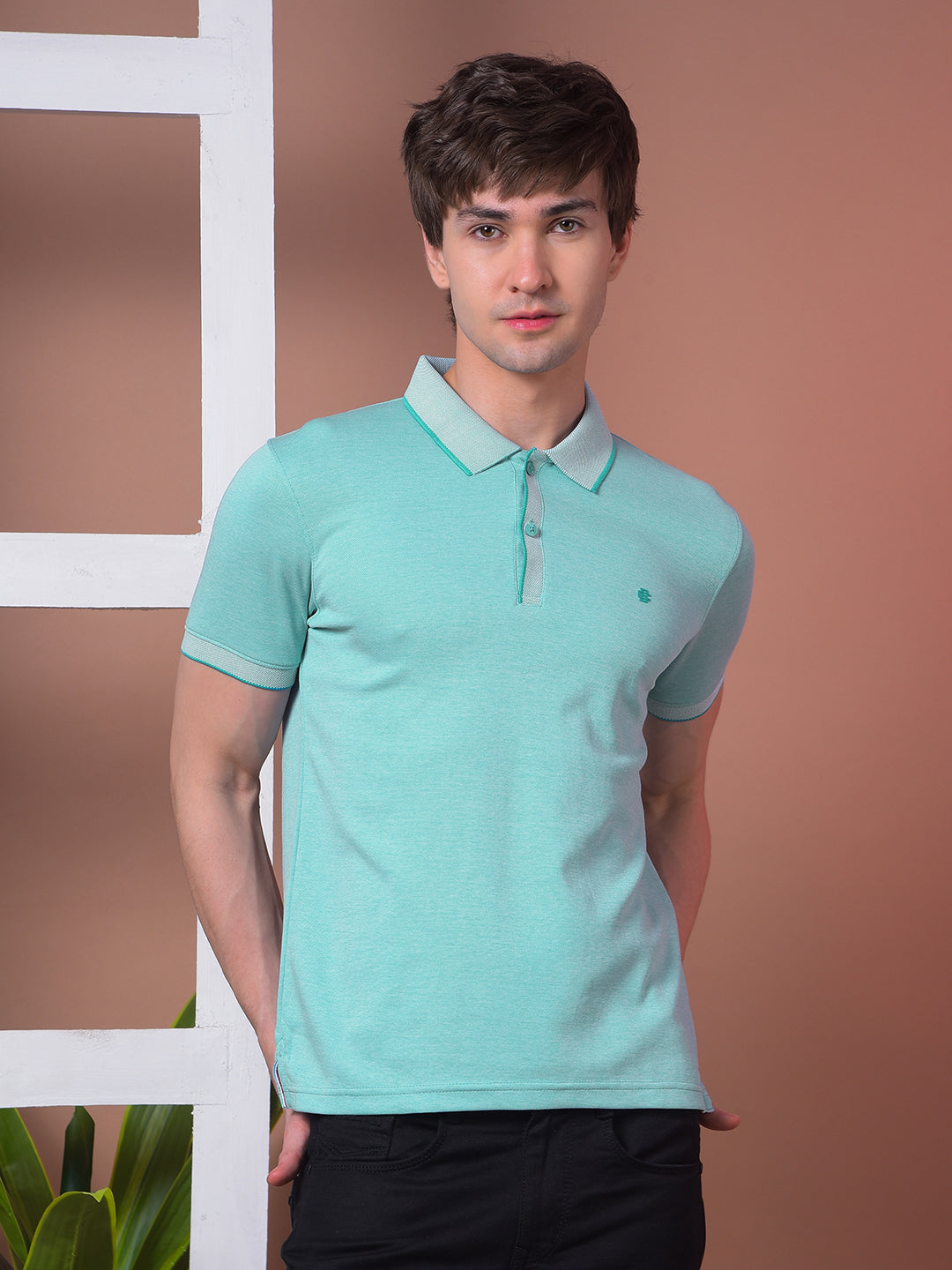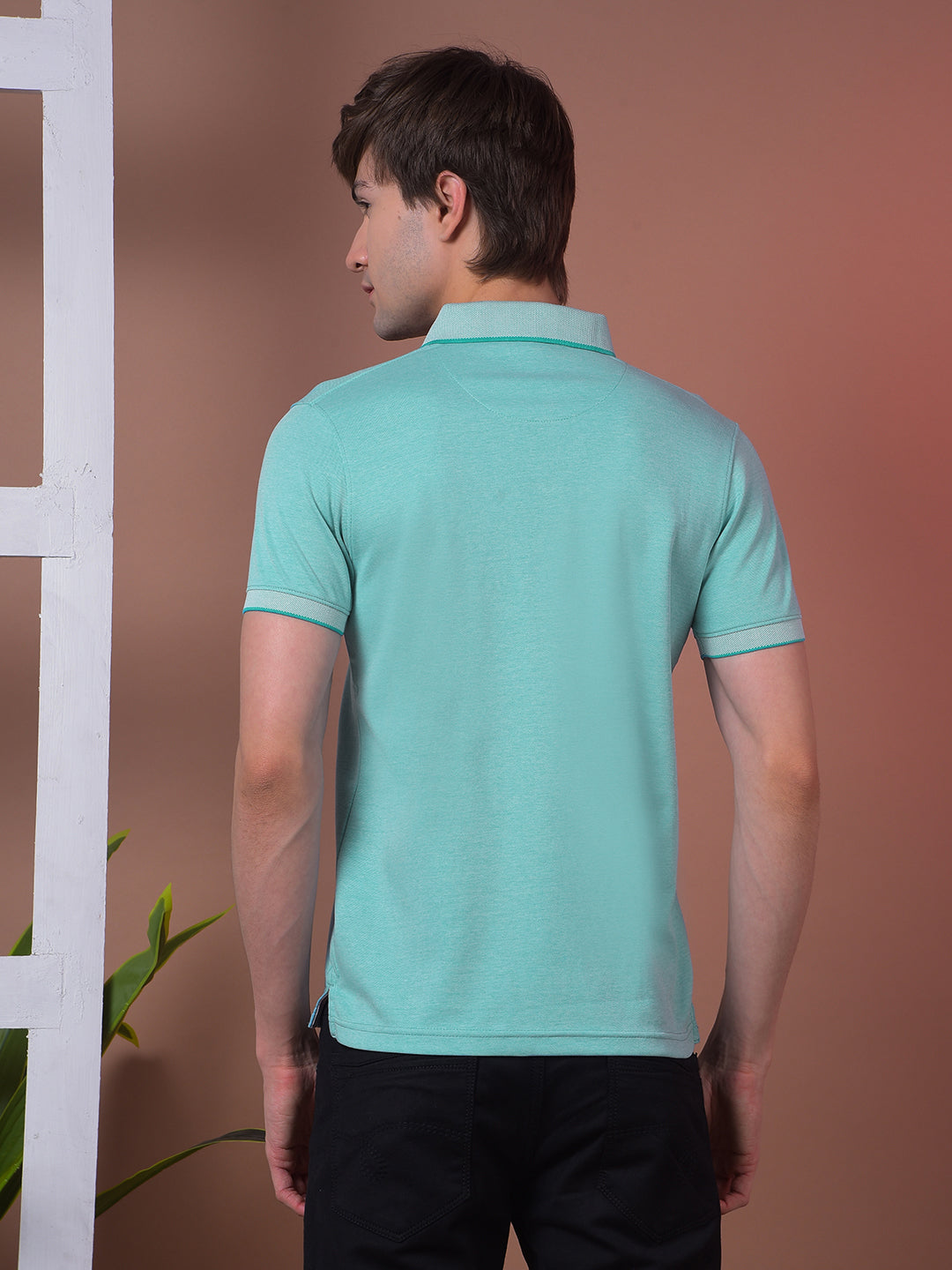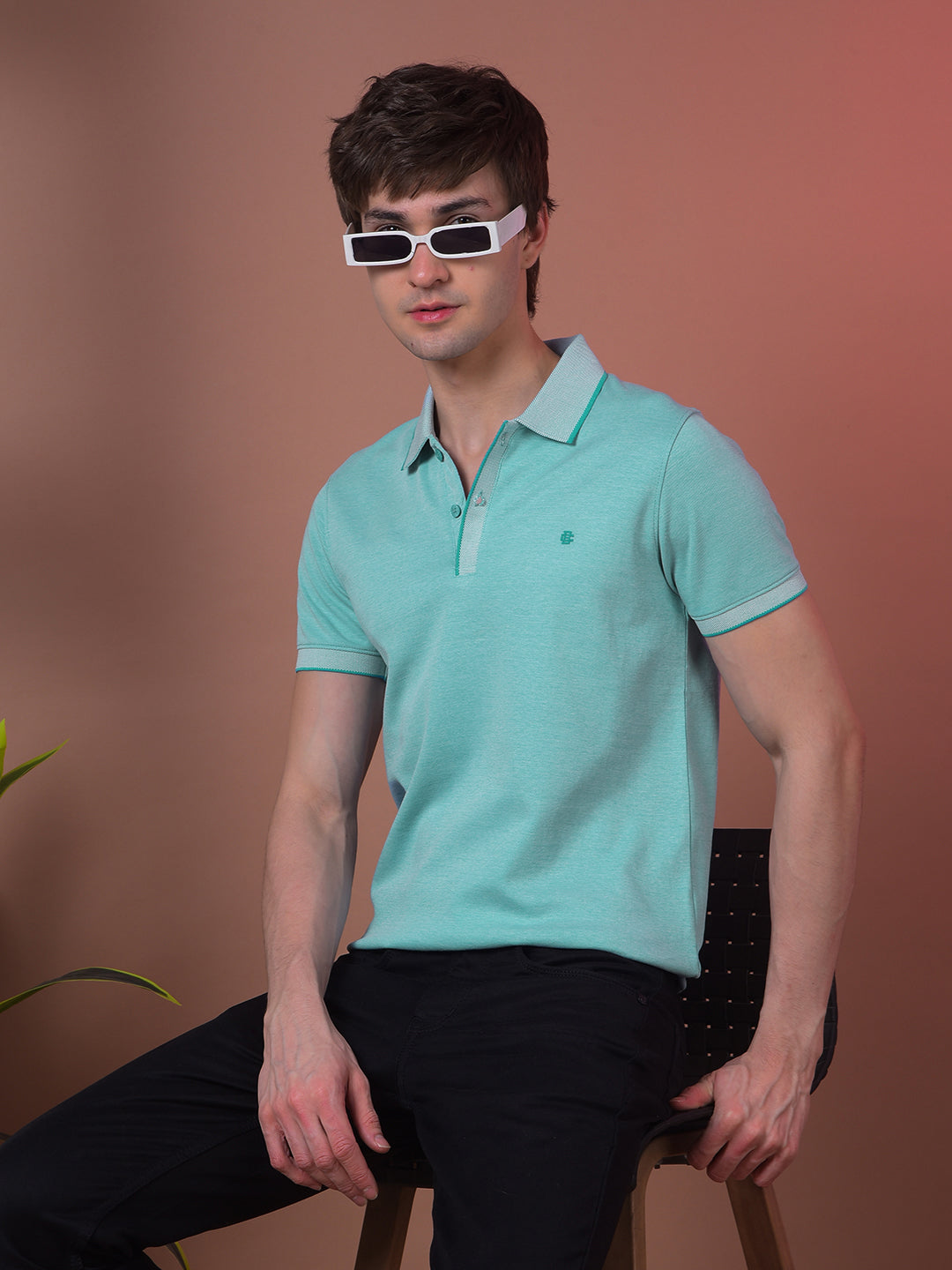 COBB Solid Sea Green Polo Neck T-Shirt offers a refreshing look with its vibrant color, soft cotton fabric, and classic collar—perfect for casual and semi-casual styling.