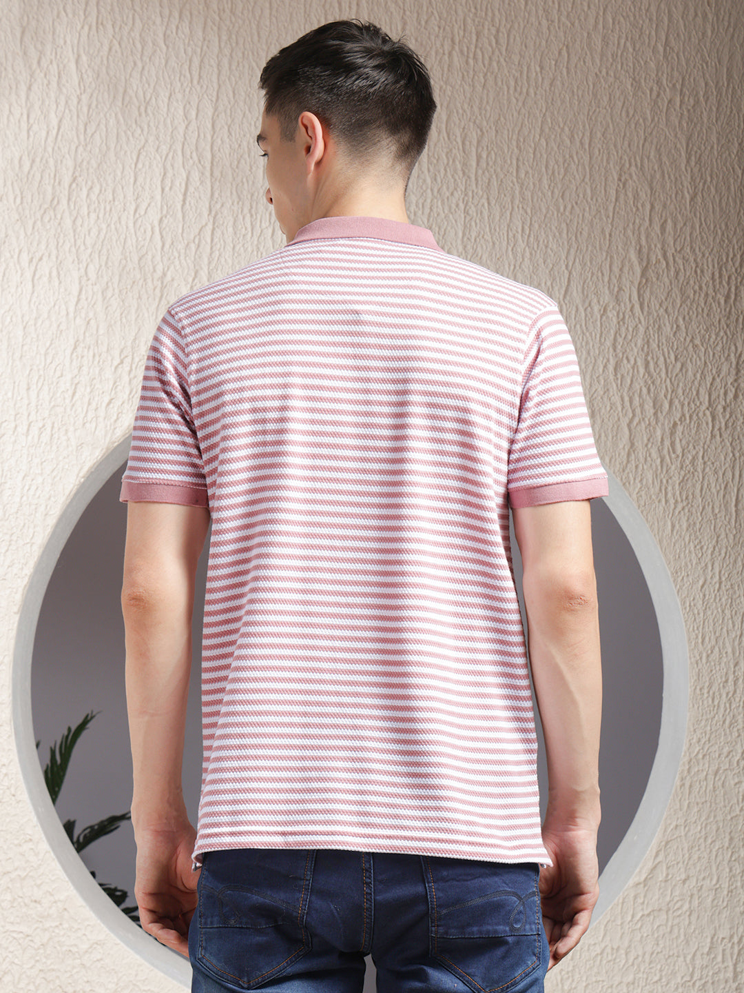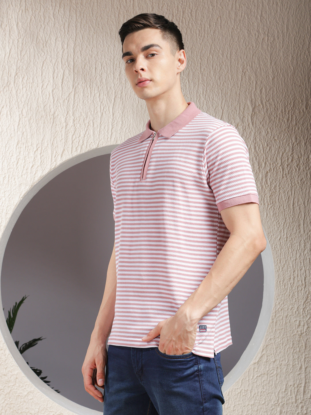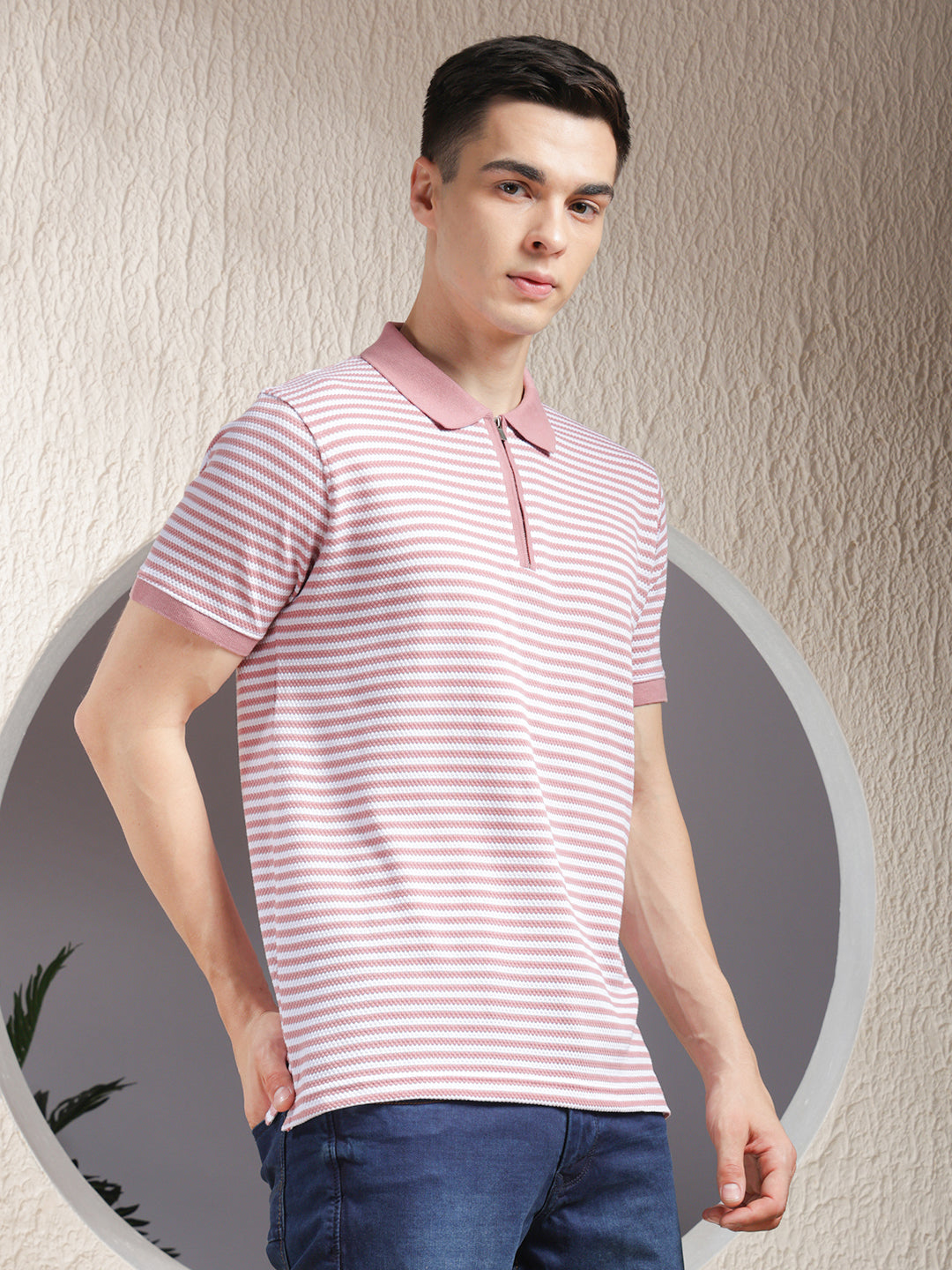 COBB Pink Striped Polo Neck Zipper T-Shirt – crafted with soft breathable fabric, featuring a trendy striped design and half-zip collar. A perfect mix of sporty and casual style for a modern wardrobe.