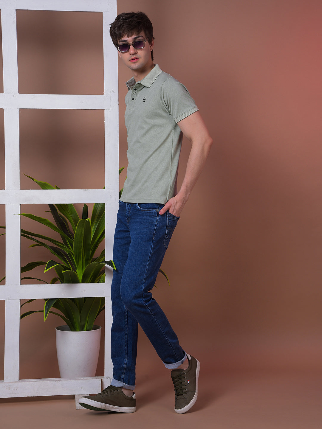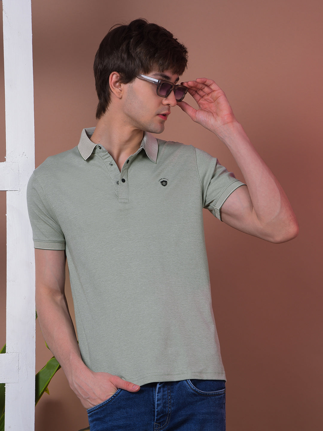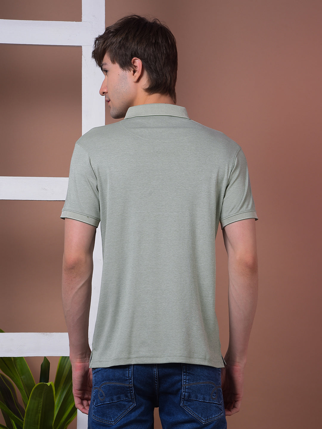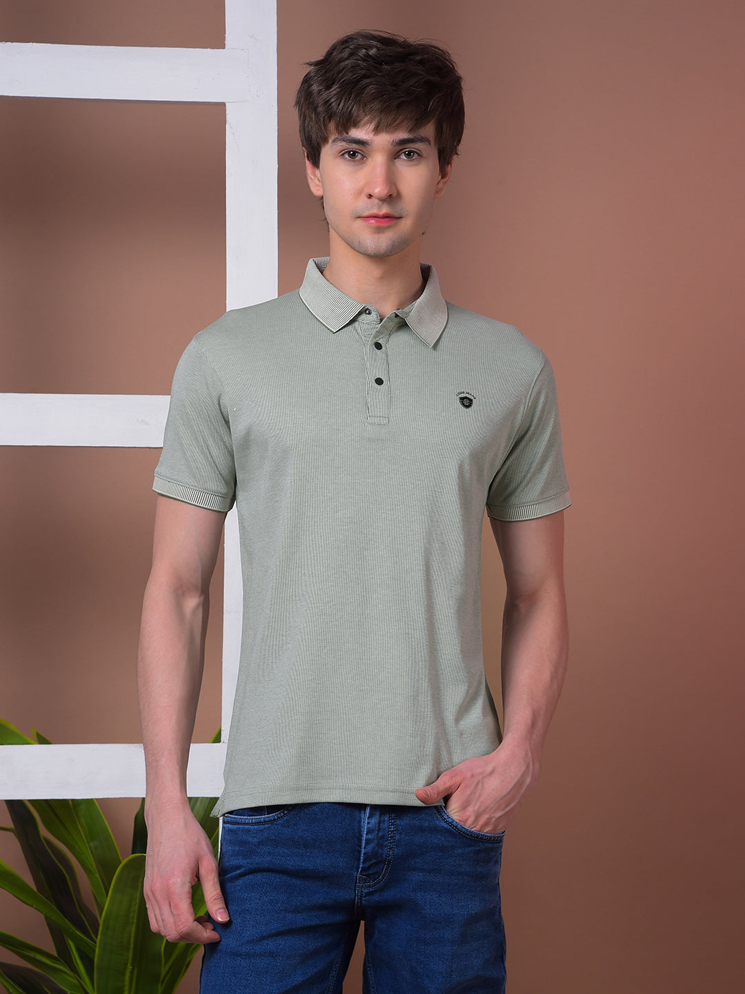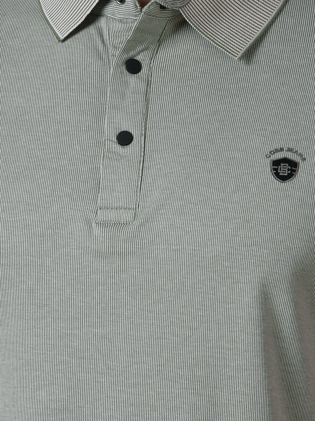 COBB Light Green Striped Polo Neck T-Shirt made with breathable cotton fabric, features classic stripes and a comfortable fit—perfect for smart-casual styling.