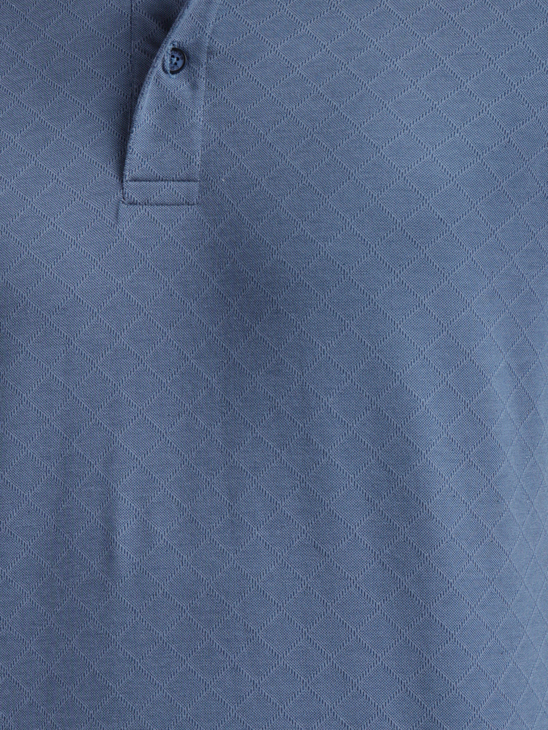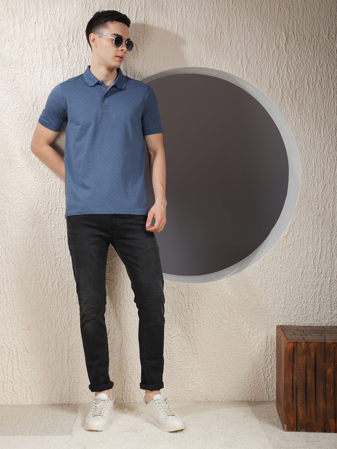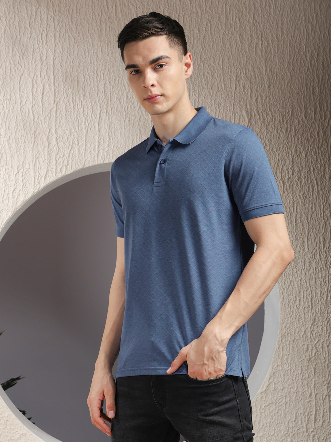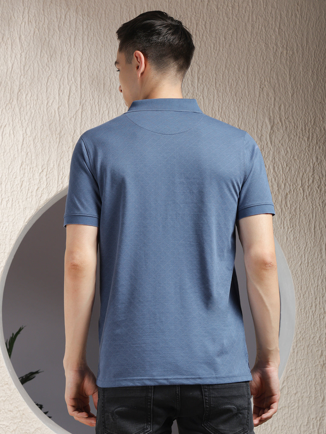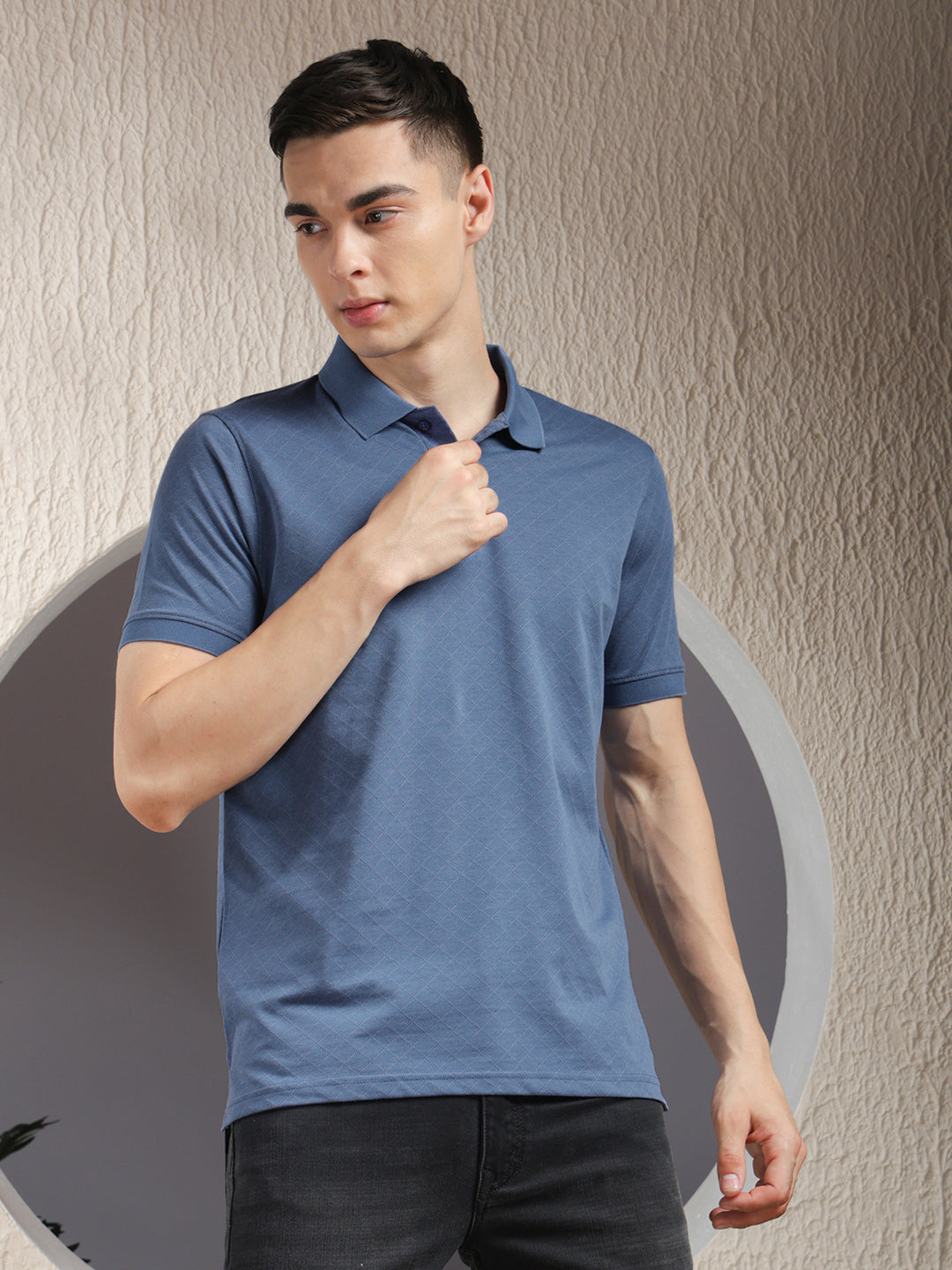 Elegant blue polo crafted with subtle self-design texture, breathable fabric, and a classic collar for a refined casual look.