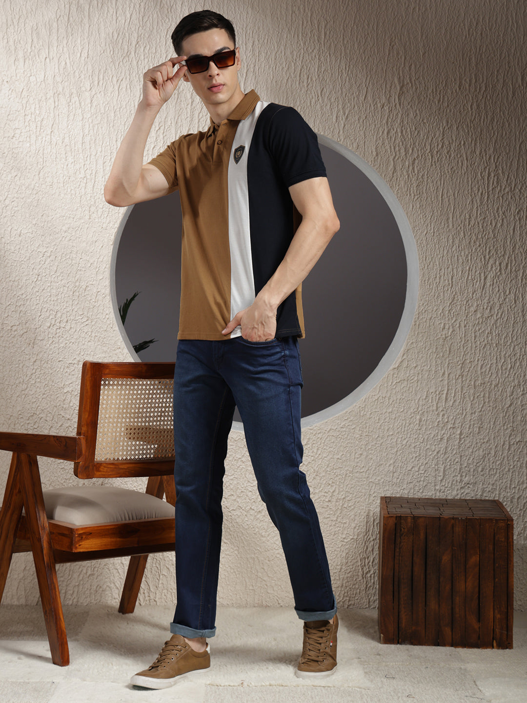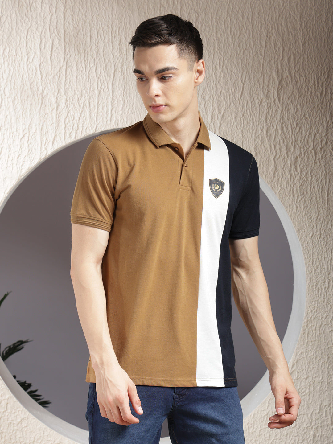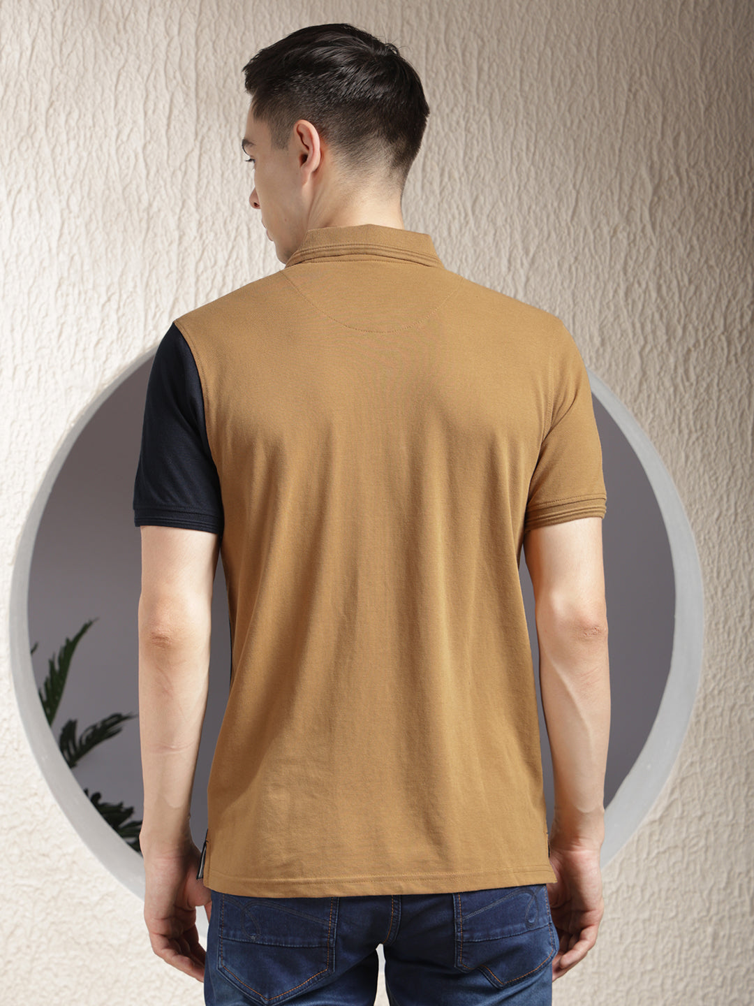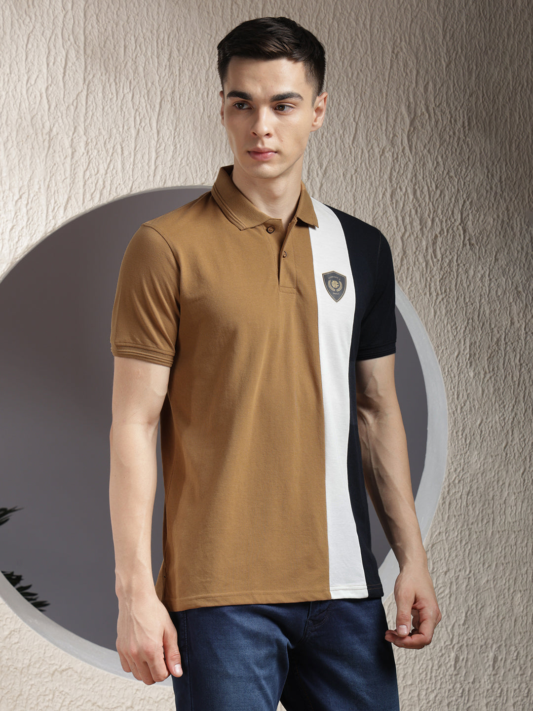 Trendy tan polo with a stylish color-block design, soft breathable fabric, and classic collar for a comfortable and fashionable casual look.