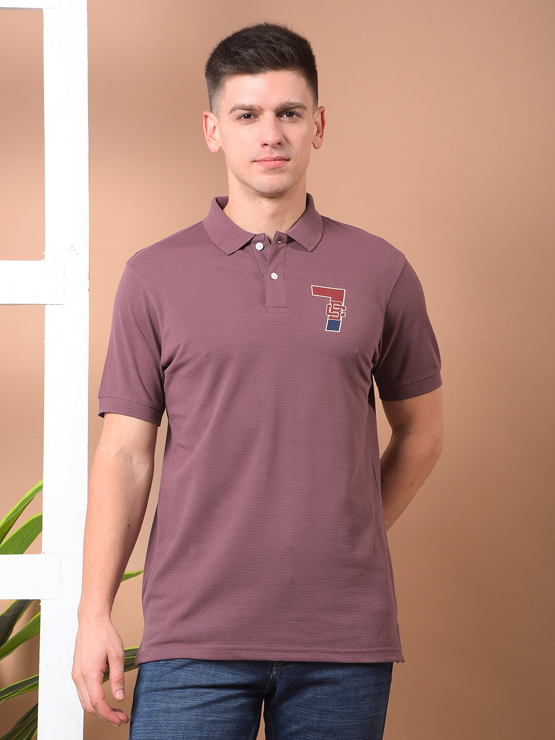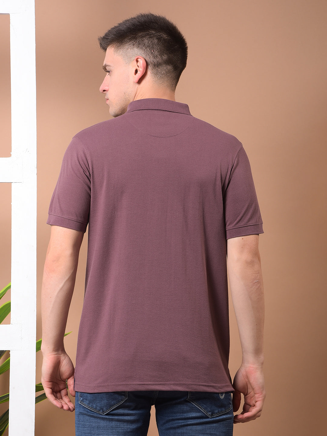 COBB Old Mauve Printed Polo Neck T-Shirt features a stylish print, comfortable cotton blend fabric, and a modern fit—ideal for smart-casual everyday wear.