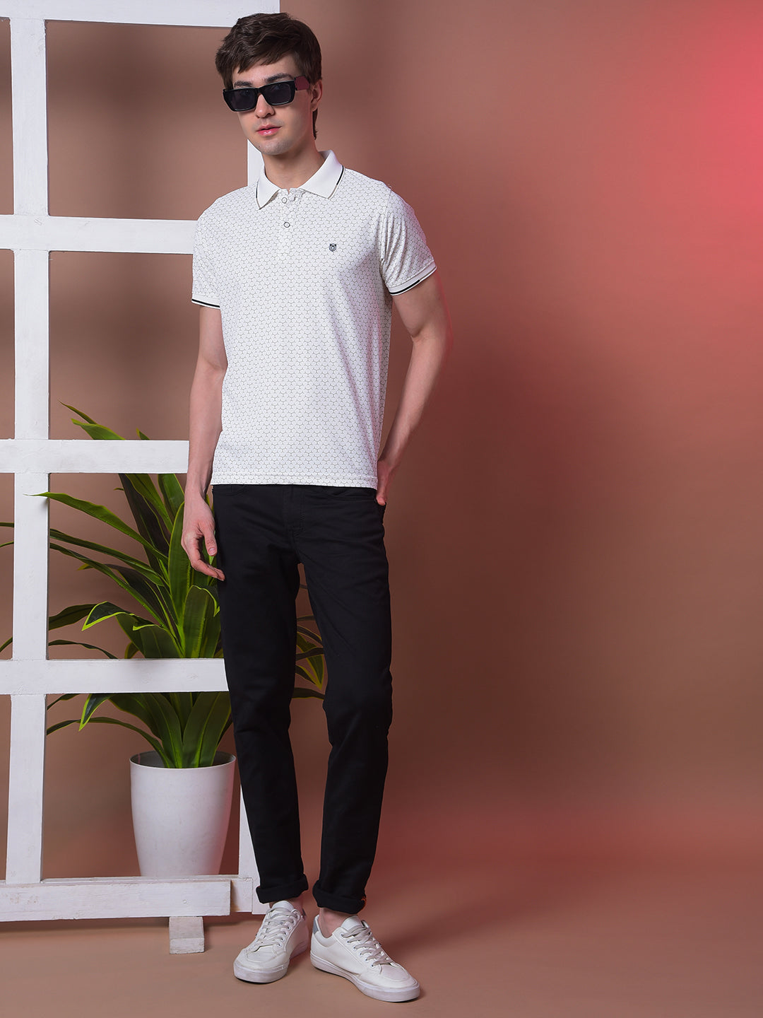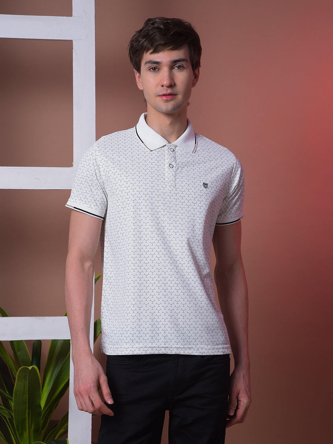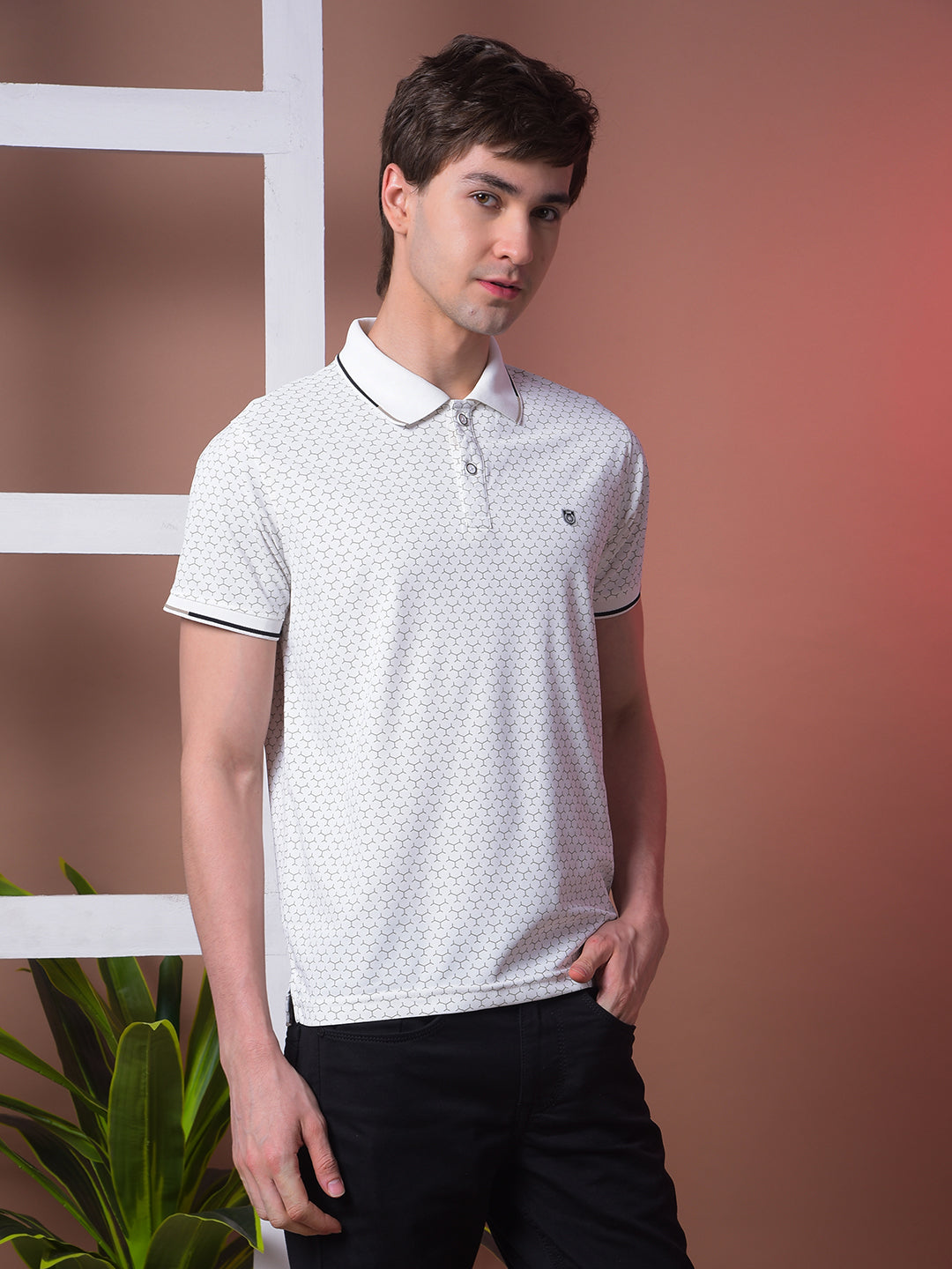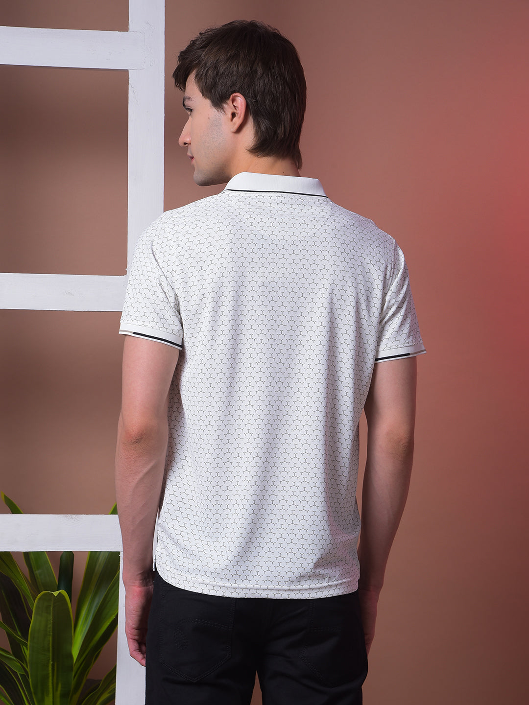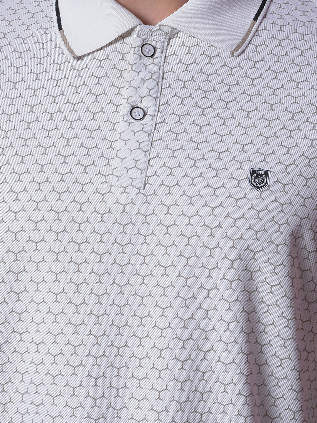 COBB White Printed Polo Neck T-Shirt crafted from premium cotton, features stylish print detail and a smart collar design, perfect for casual and semi-formal looks.