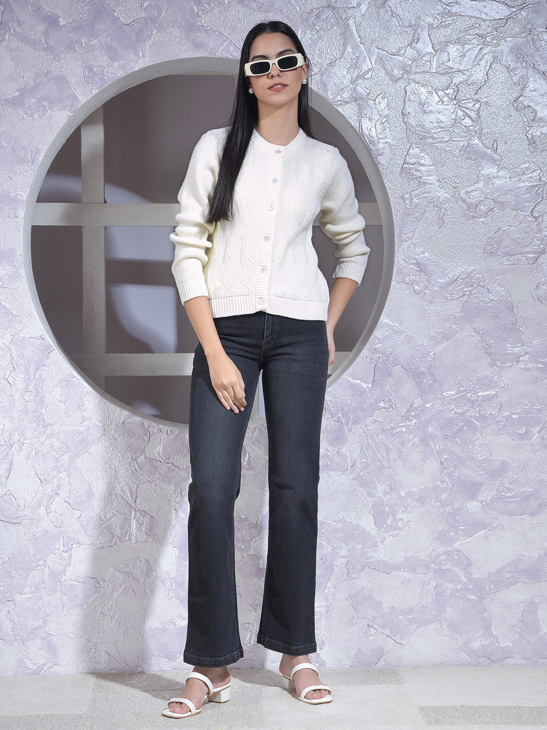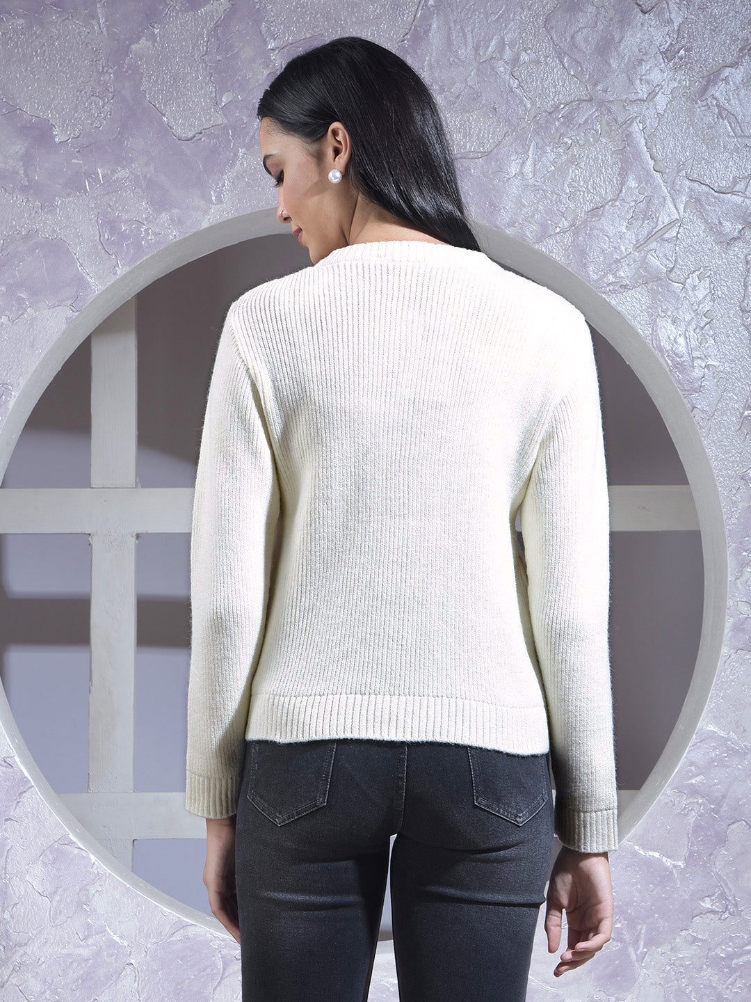 MISS FOREVER Off White Self-Design Sweater – a chic and elegant knit crafted with subtle self-design patterns, soft and warm fabric, and a comfortable fit, perfect for a classy winter look.