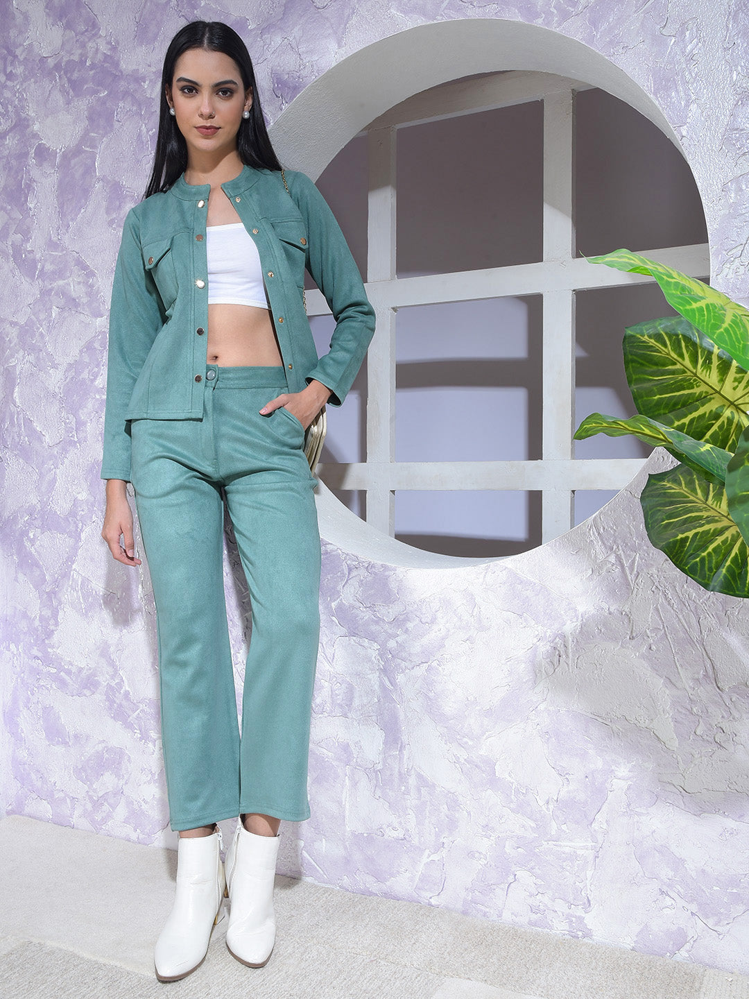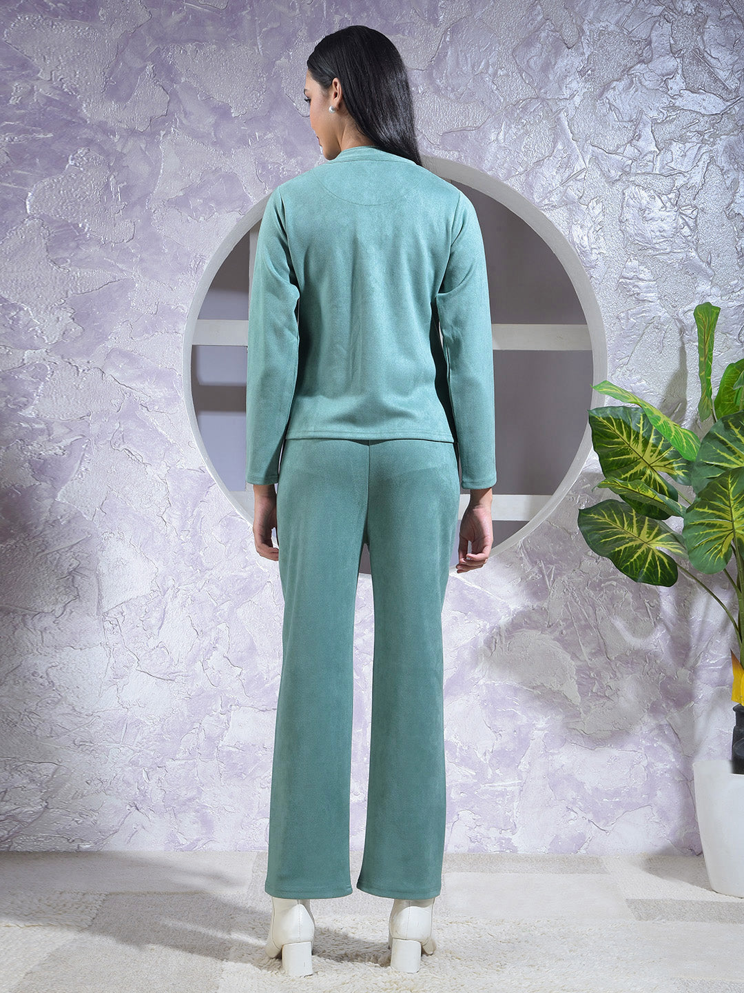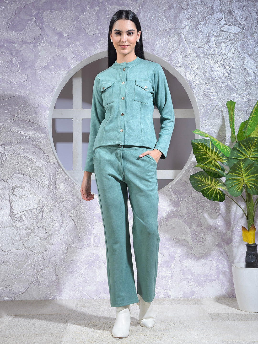 MISS FOREVER Solid Mint Winter Co-ord Set – a trendy two-piece set with a soft top and matching bottoms, offering cozy warmth and a fresh, stylish look for the winter season.