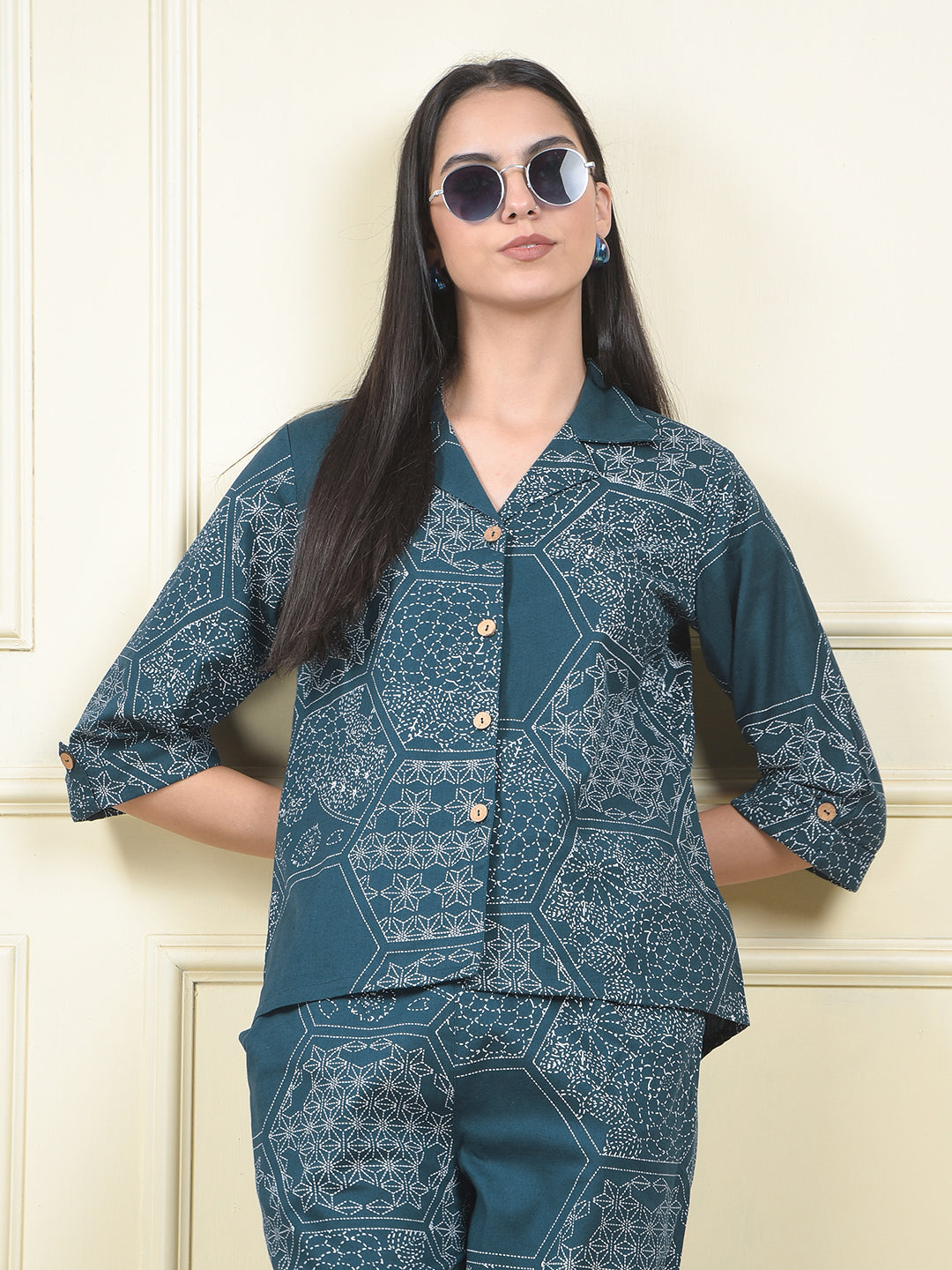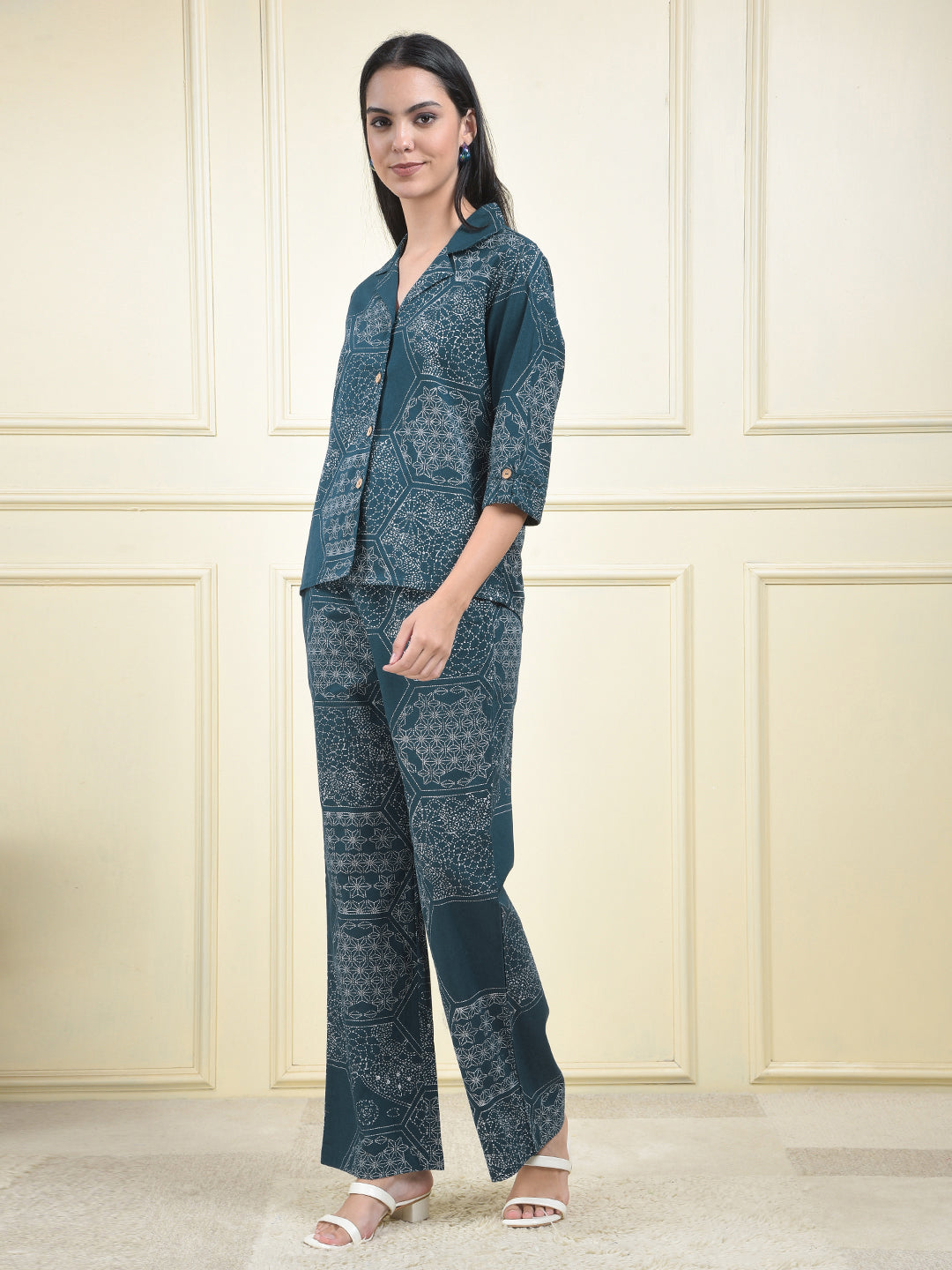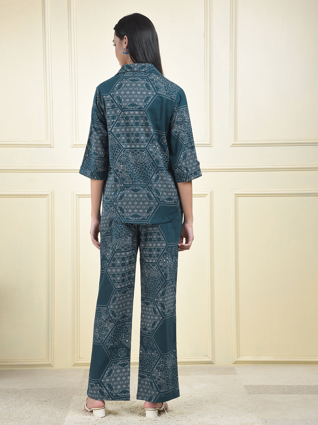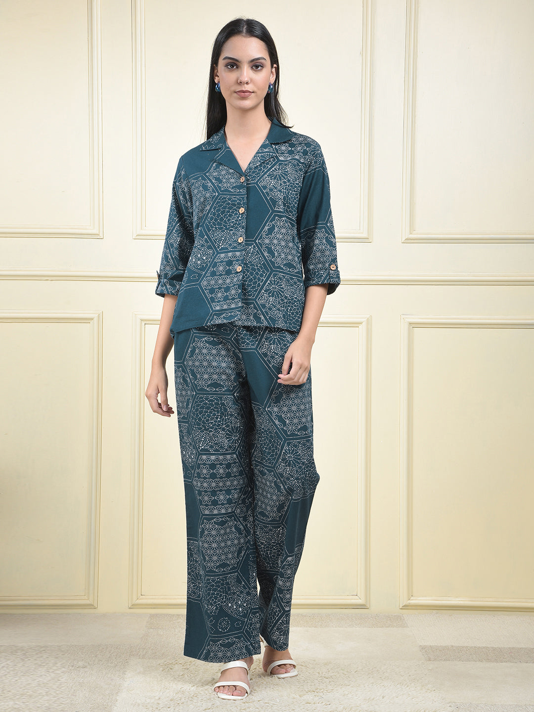 MISS FOREVER Teal Blue Co-ord Set – a stylish two-piece outfit featuring a soft teal blue top and matching bottoms, designed for comfort, elegance, and a chic look for casual or semi-formal occasions.